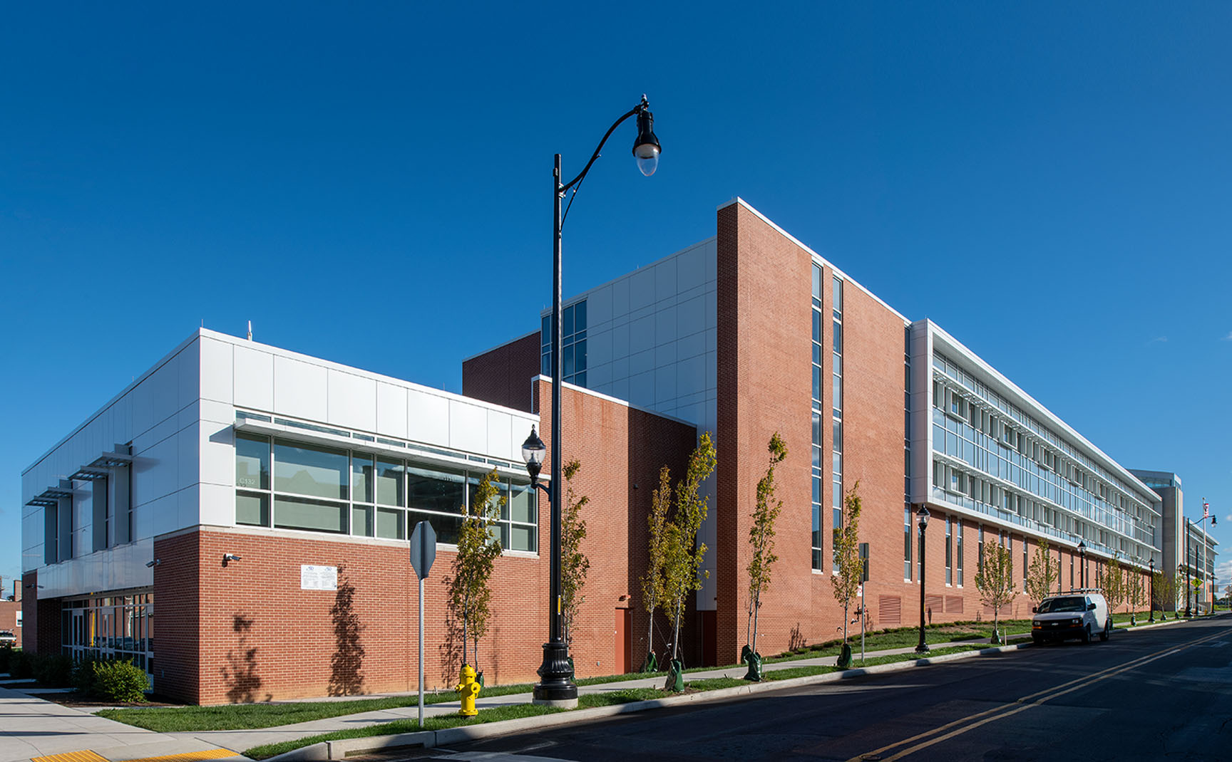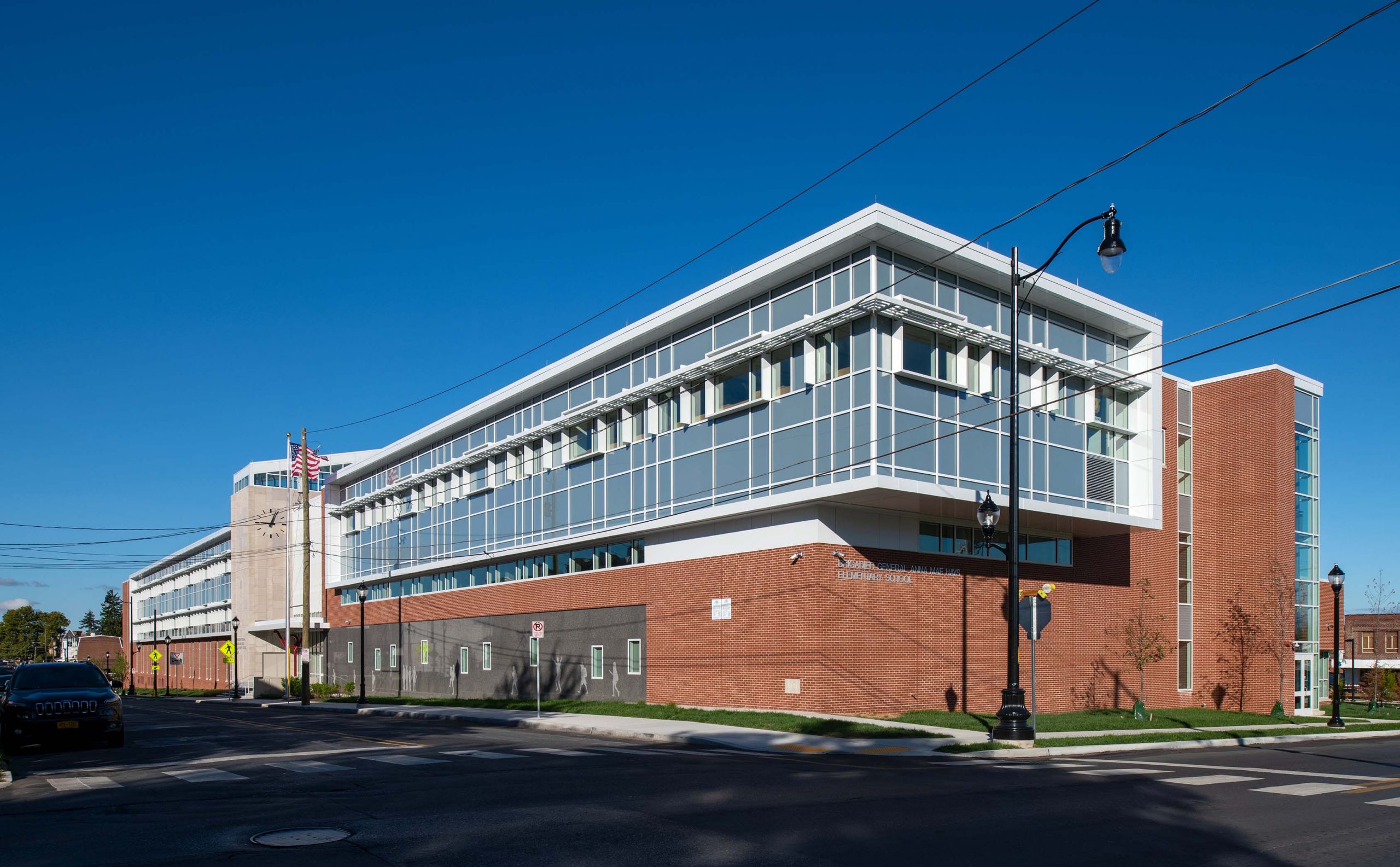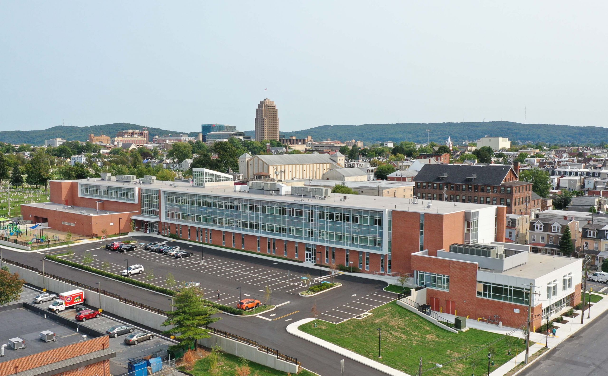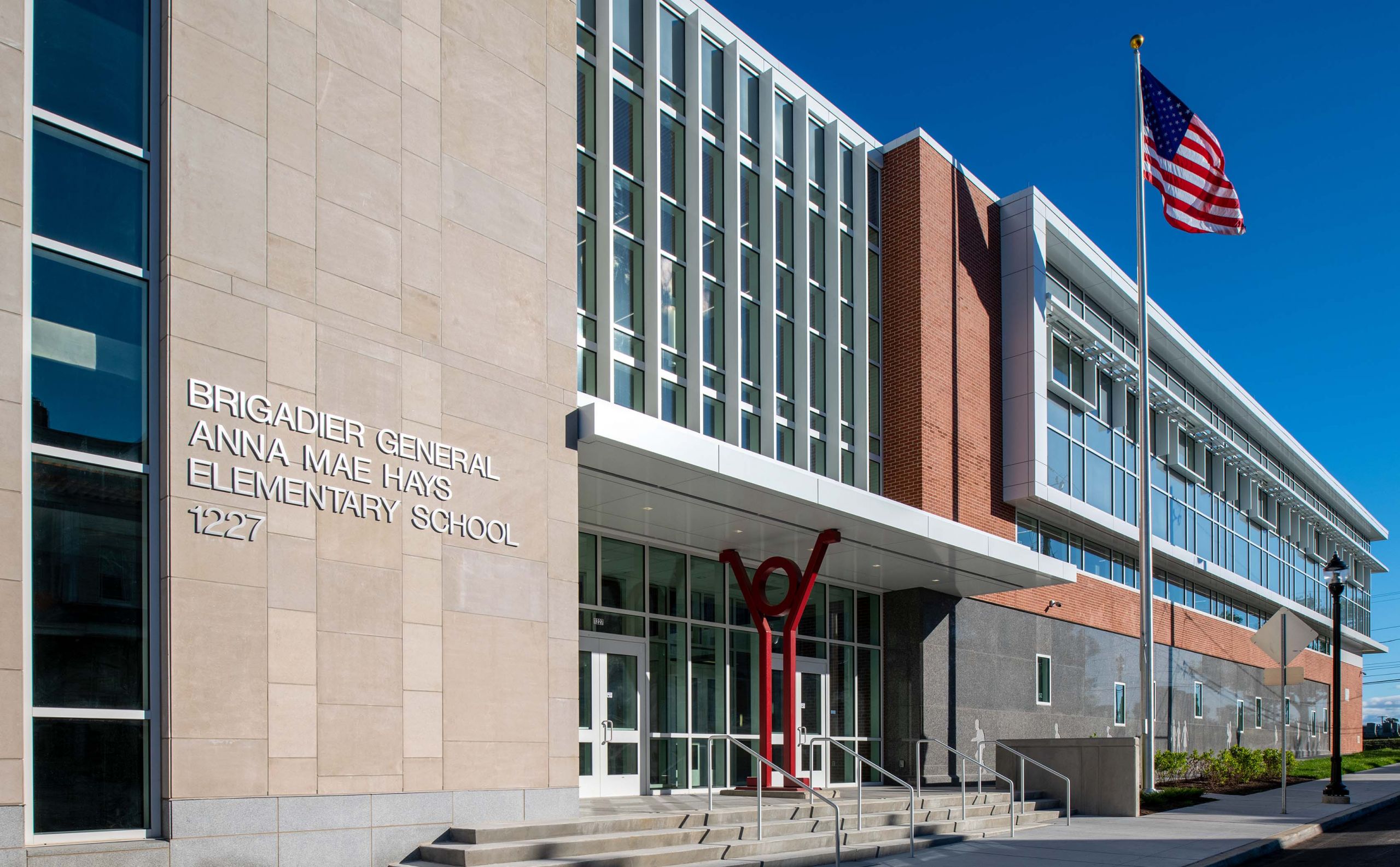 Located in the urban core of the Pennsylvania’s third largest city, Brigadier General Anna Mae Hays Elementary School opened in the Fall 2020 to approximately 850 students in grades K-5. Named in honor of the first female General and Allentown native, the 114,000 sf school sits on a 2.5-acre repurposed industrial site that straddles a transition between medium density residential and light manufacturing areas. Site amenities include staff parking for 75 vehicles, service access, bus and car drop off, and 3,000 sf playground fully open to community use. The School’s two major building volumes are the 4-story Academic Wing to the west and a 2-story Shared Facility Wing to the east. These are linked by the school’s central Main Lobby. Above the main floor, a glass enclosed bridge passes through the Lobby connecting the wings at the upper levels. Two other glass-walled overlooks offer unique small group instructional spaces as well as dramatic views to the exterior: Allentown’s center city skyline in one direction and the distant Blue Mountain in the other. The completion of the Hays Elementary School is a major milestone in the Allentown School District’s commitment to renewing its instructional resources for 21st century education and fully integrating schools within their neighborhood, nurturing a genuine partnership with the community.
