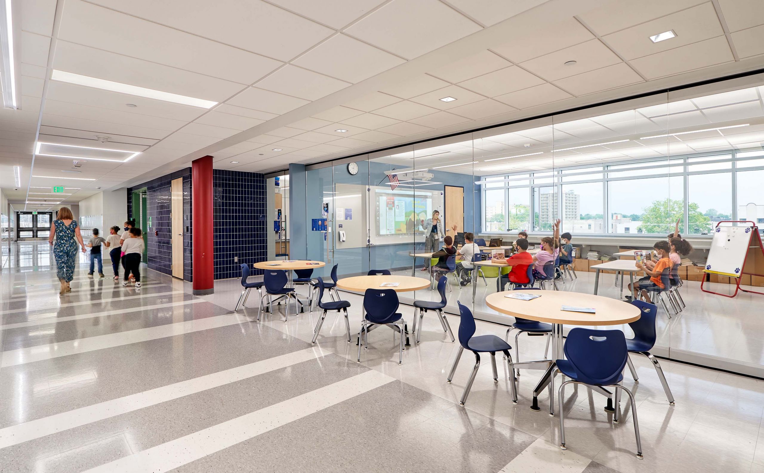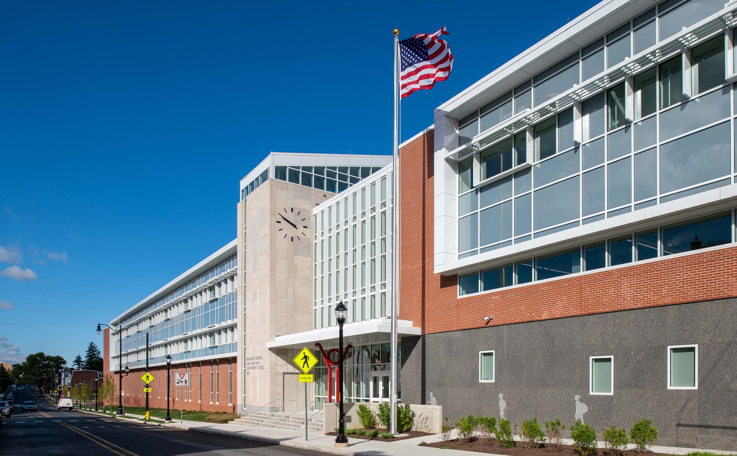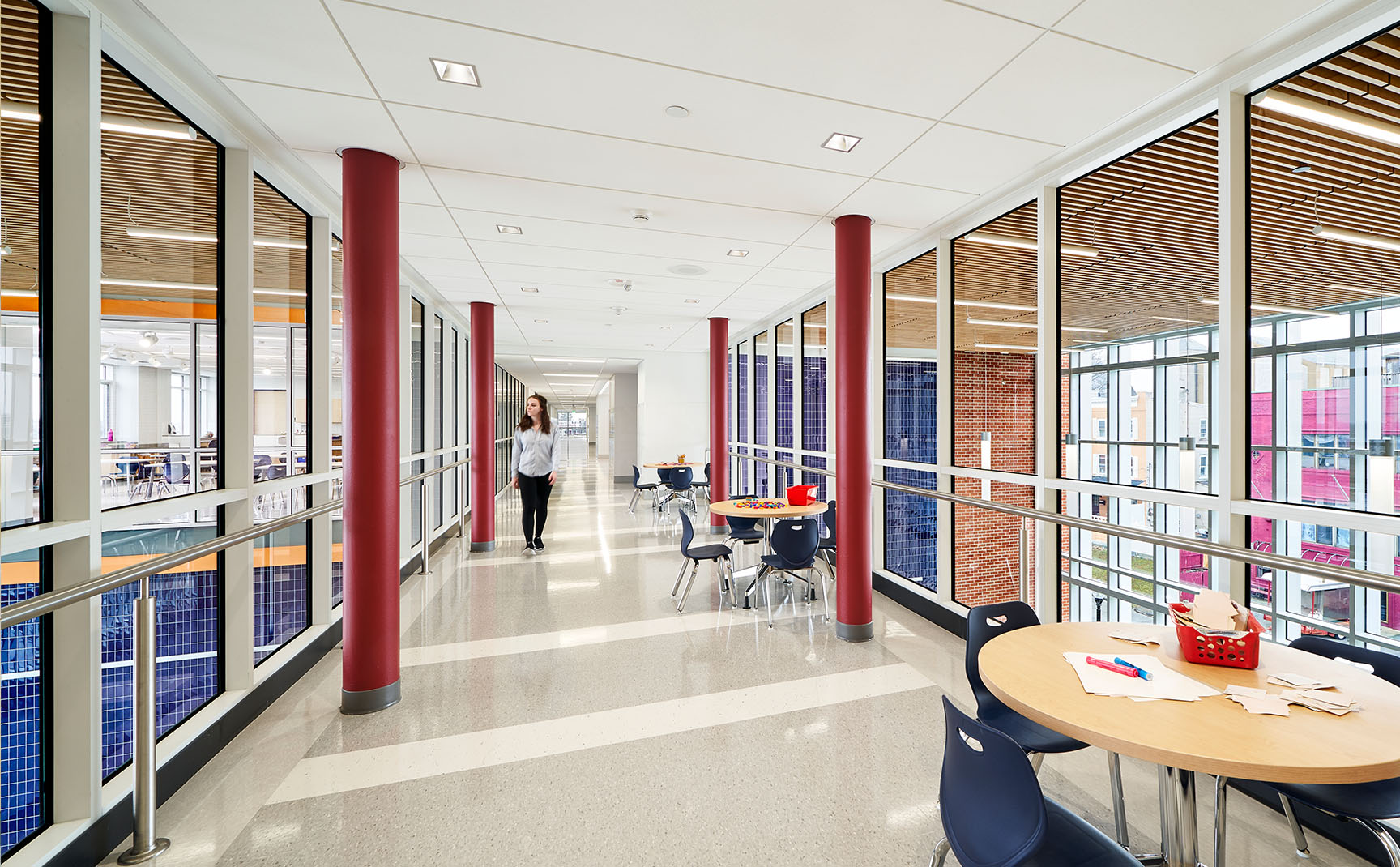 Located in the urban core of the Pennsylvania’s third largest city, Brigadier General Anna Mae Hays Elementary School opened in the Fall 2020 to approximately 850 students in grades K-5. Named in honor of the first female General and Allentown native, the 114,000 sf school sits on a 2.5-acre repurposed industrial site that straddles a transition between medium density residential and light manufacturing areas. Site amenities include staff parking for 75 vehicles, service access, bus and car drop off, and 3,000 sf playground fully open to community use. The School’s two major building volumes are the 4-story Academic Wing to the west and a 2-story Shared Facility Wing to the east. These are linked by the school’s central Main Lobby. Above the main floor, a glass enclosed bridge passes through the Lobby connecting the wings at the upper levels. Two other glass-walled overlooks offer unique small group instructional spaces as well as dramatic views to the exterior: Allentown’s center city skyline in one direction and the distant Blue Mountain in the other. The completion of the Hays Elementary School is a major milestone in the Allentown School District’s commitment to renewing its instructional resources for 21st century education and fully integrating schools within their neighborhood, nurturing a genuine partnership with the community.