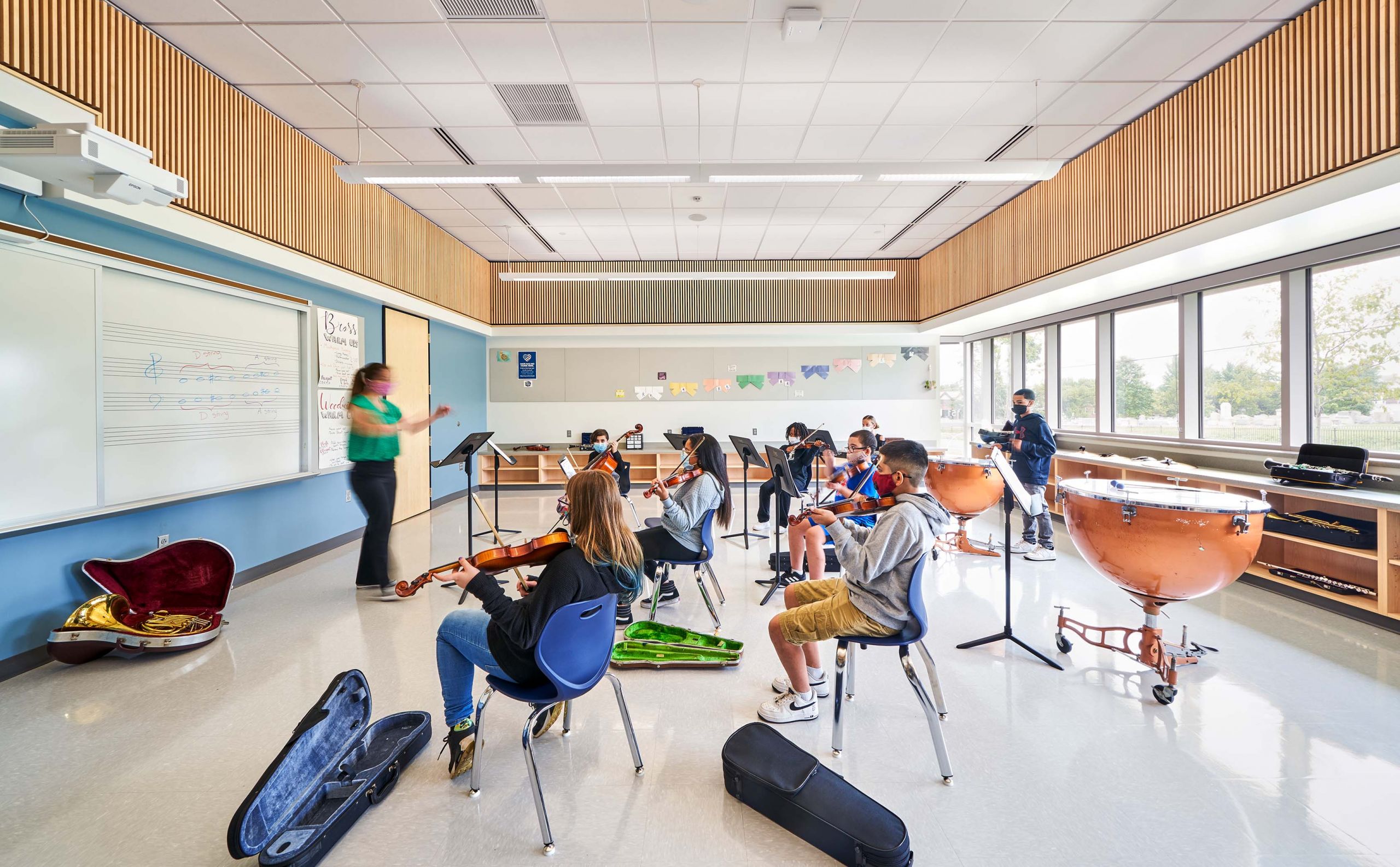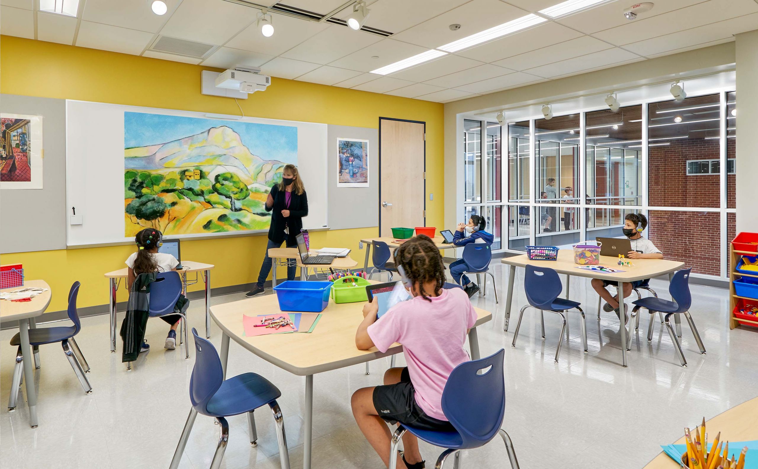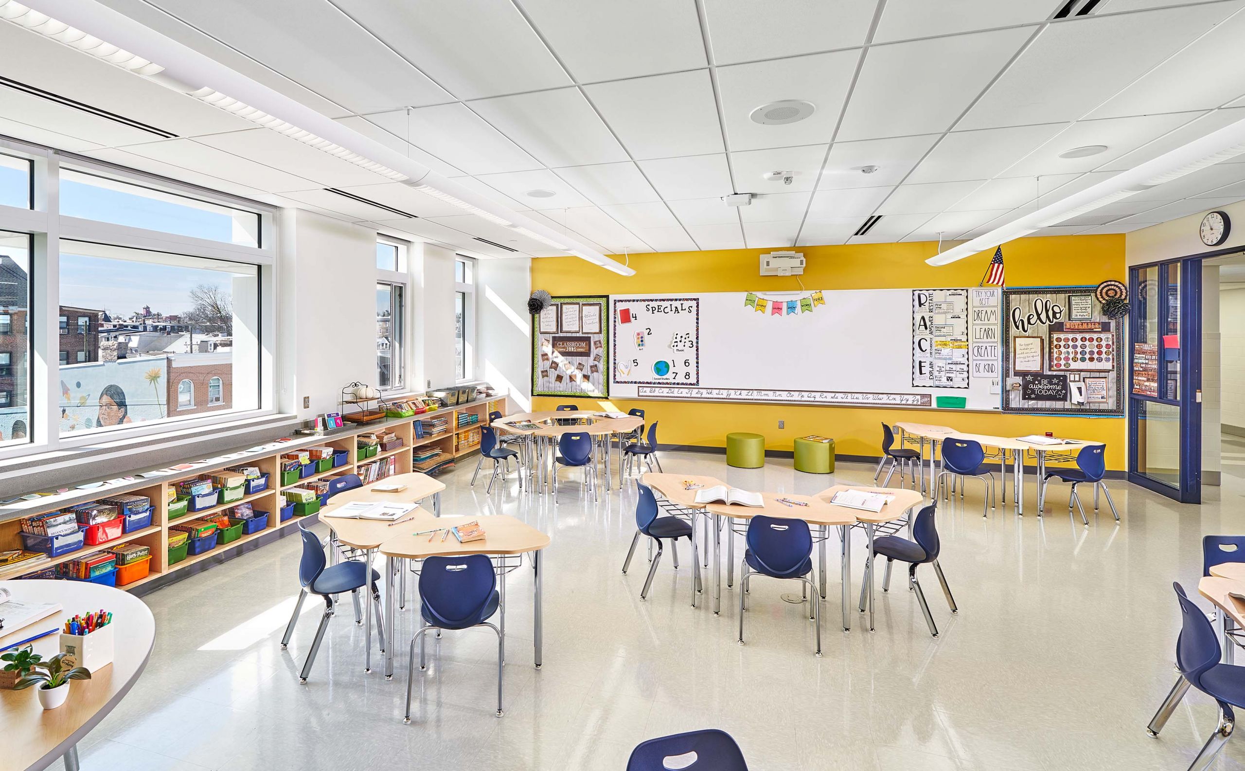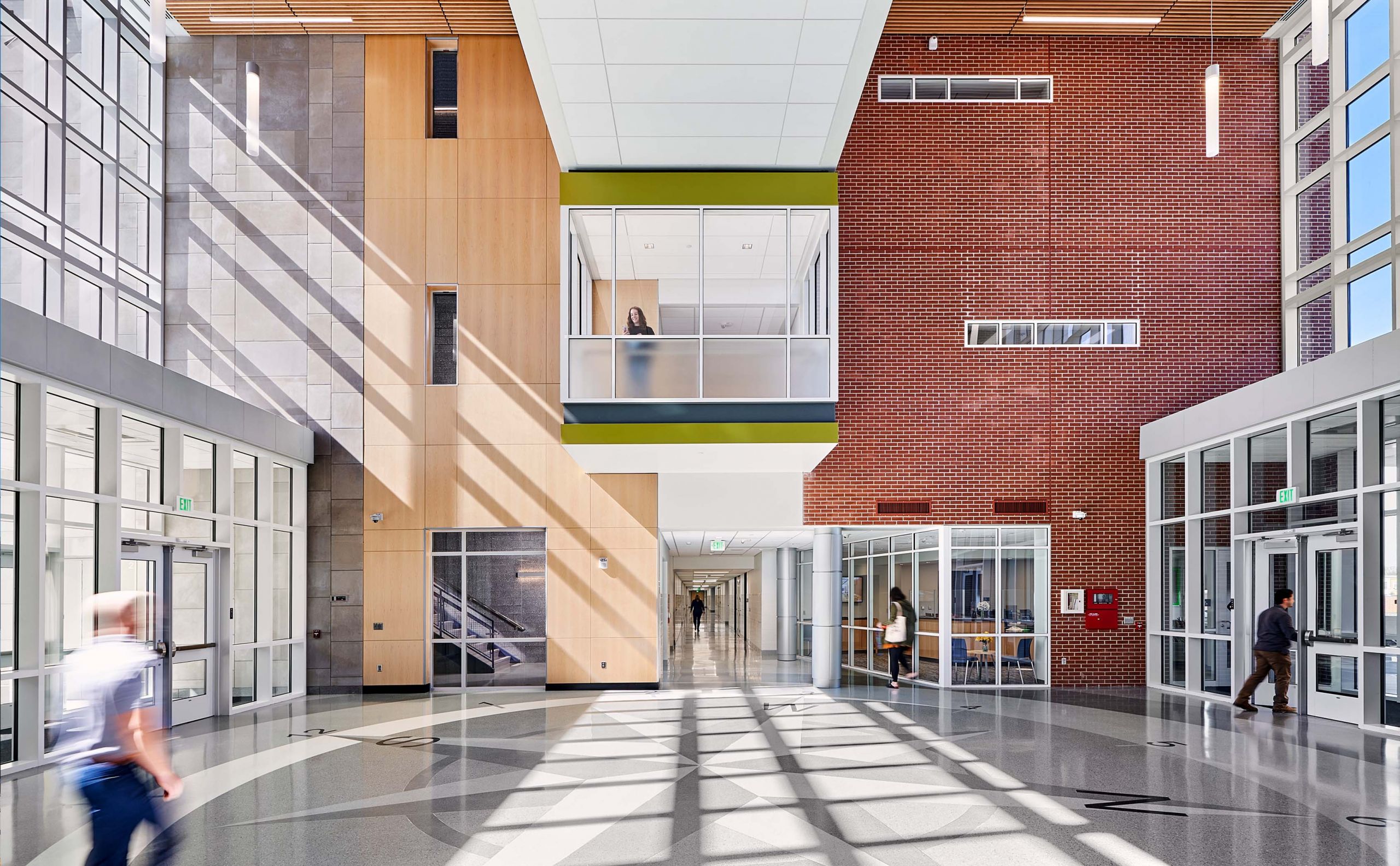 Located in the urban core of the Pennsylvania’s third largest city, Brigadier General Anna Mae Hays Elementary School opened in the Fall 2020 to approximately 850 students in grades K-5. Named in honor of the first female General and Allentown native, the 114,000 sf school sits on a 2.5-acre repurposed industrial site that straddles a transition between medium density residential and light manufacturing areas. Site amenities include staff parking for 75 vehicles, service access, bus and car drop off, and 3,000 sf playground fully open to community use. The School’s two major building volumes are the 4-story Academic Wing to the west and a 2-story Shared Facility Wing to the east. These are linked by the school’s central Main Lobby. Above the main floor, a glass enclosed bridge passes through the Lobby connecting the wings at the upper levels. Two other glass-walled overlooks offer unique small group instructional spaces as well as dramatic views to the exterior: Allentown’s center city skyline in one direction and the distant Blue Mountain in the other. The completion of the Hays Elementary School is a major milestone in the Allentown School District’s commitment to renewing its instructional resources for 21st century education and fully integrating schools within their neighborhood, nurturing a genuine partnership with the community.