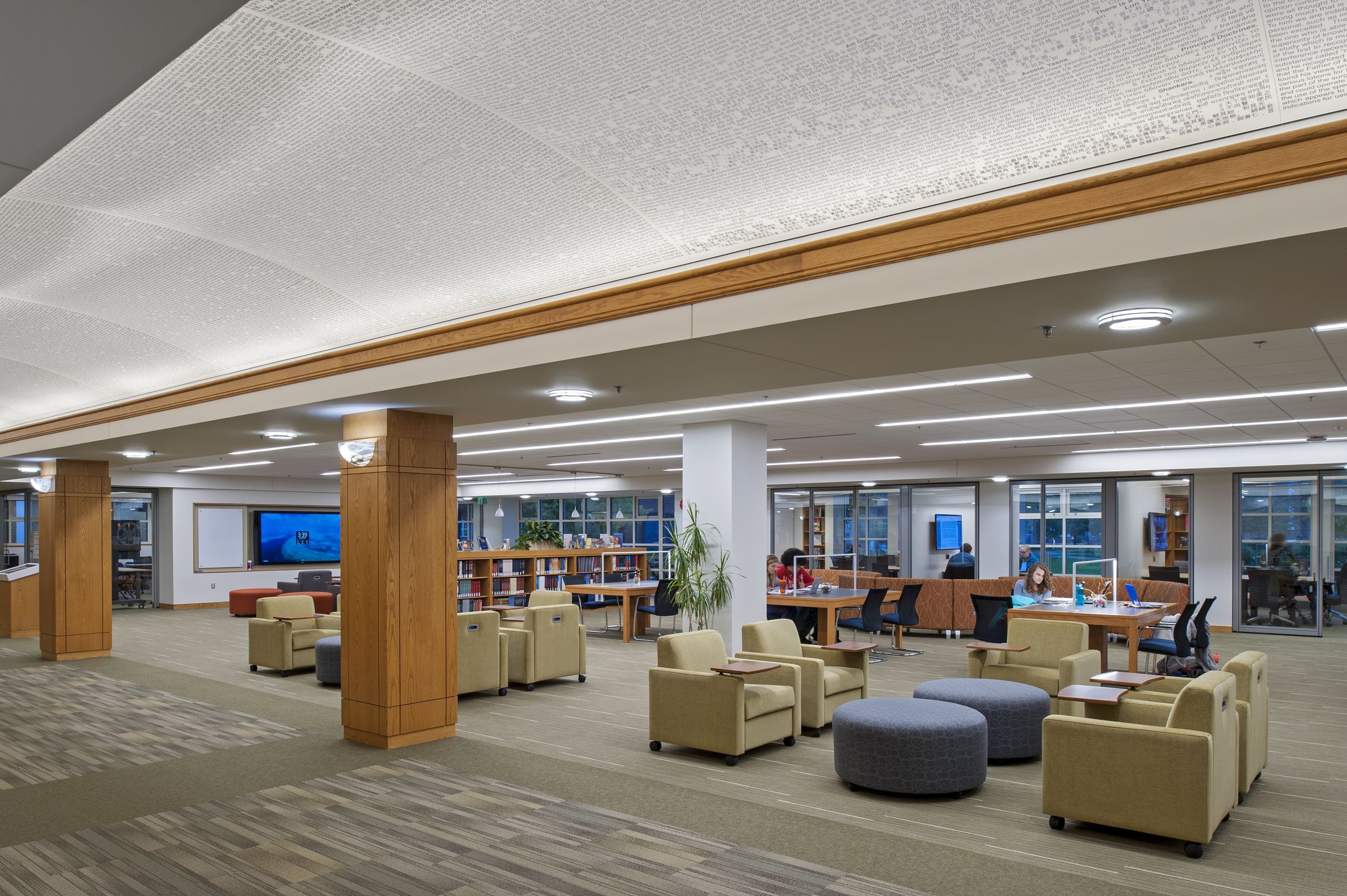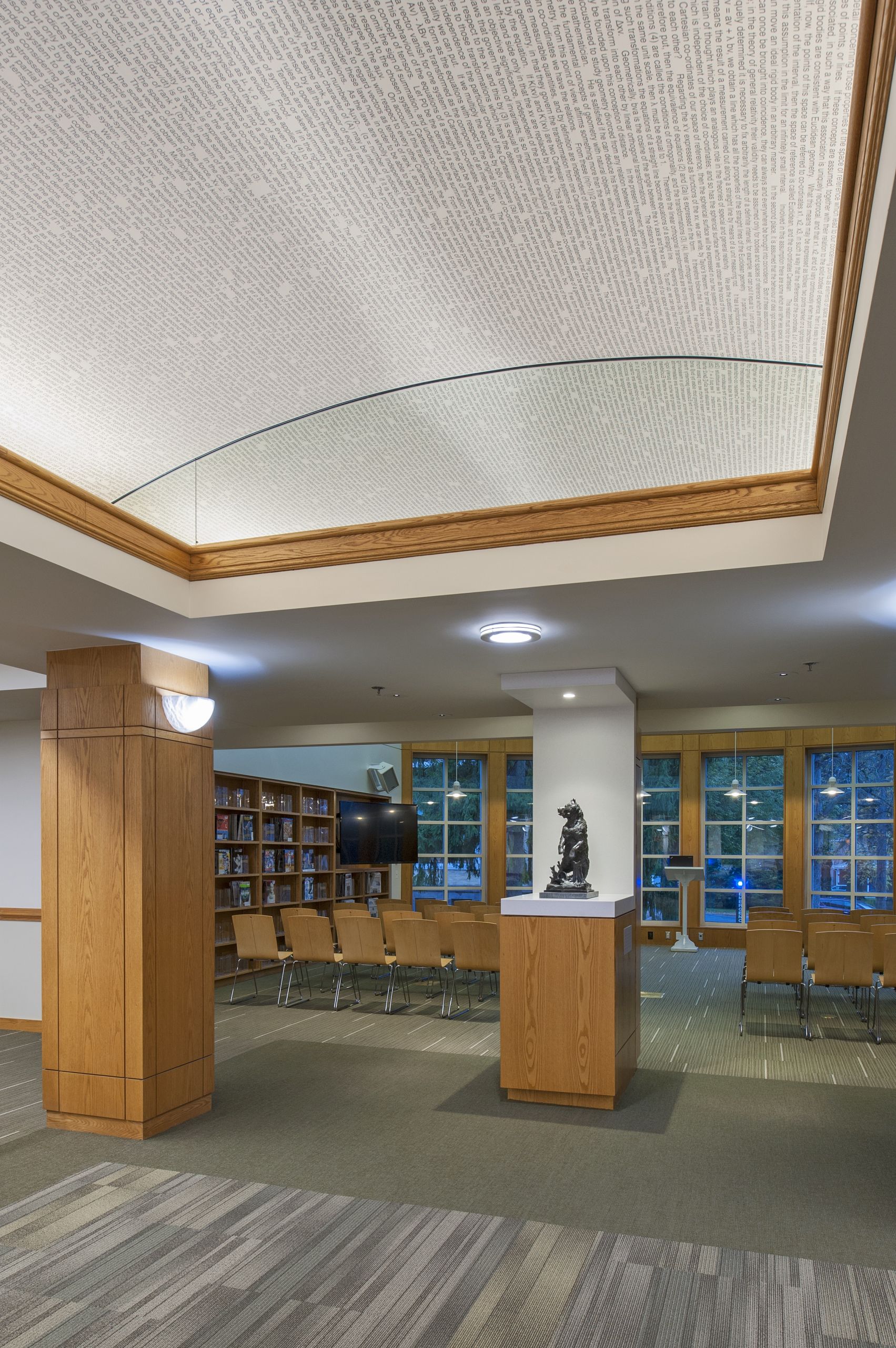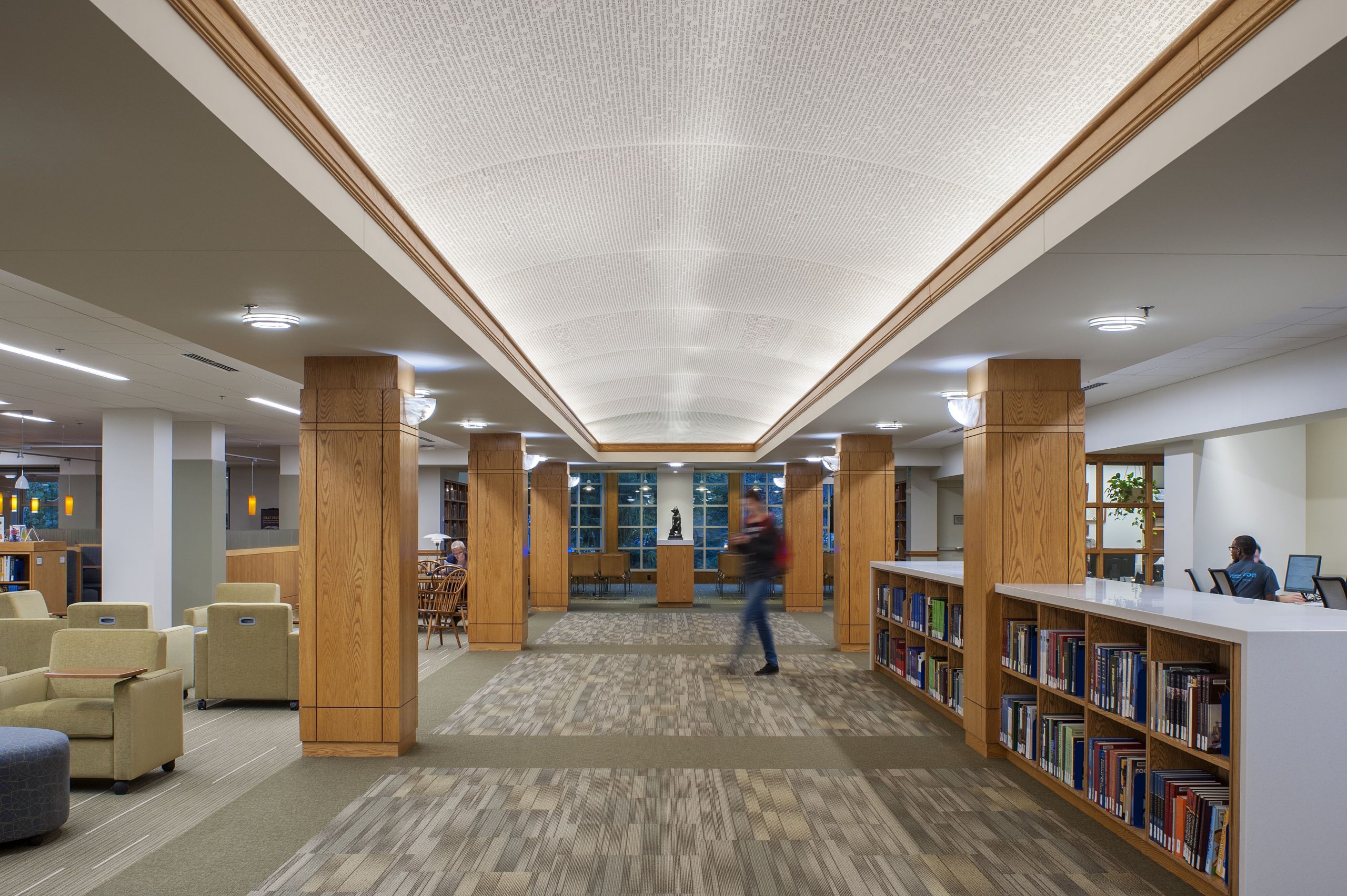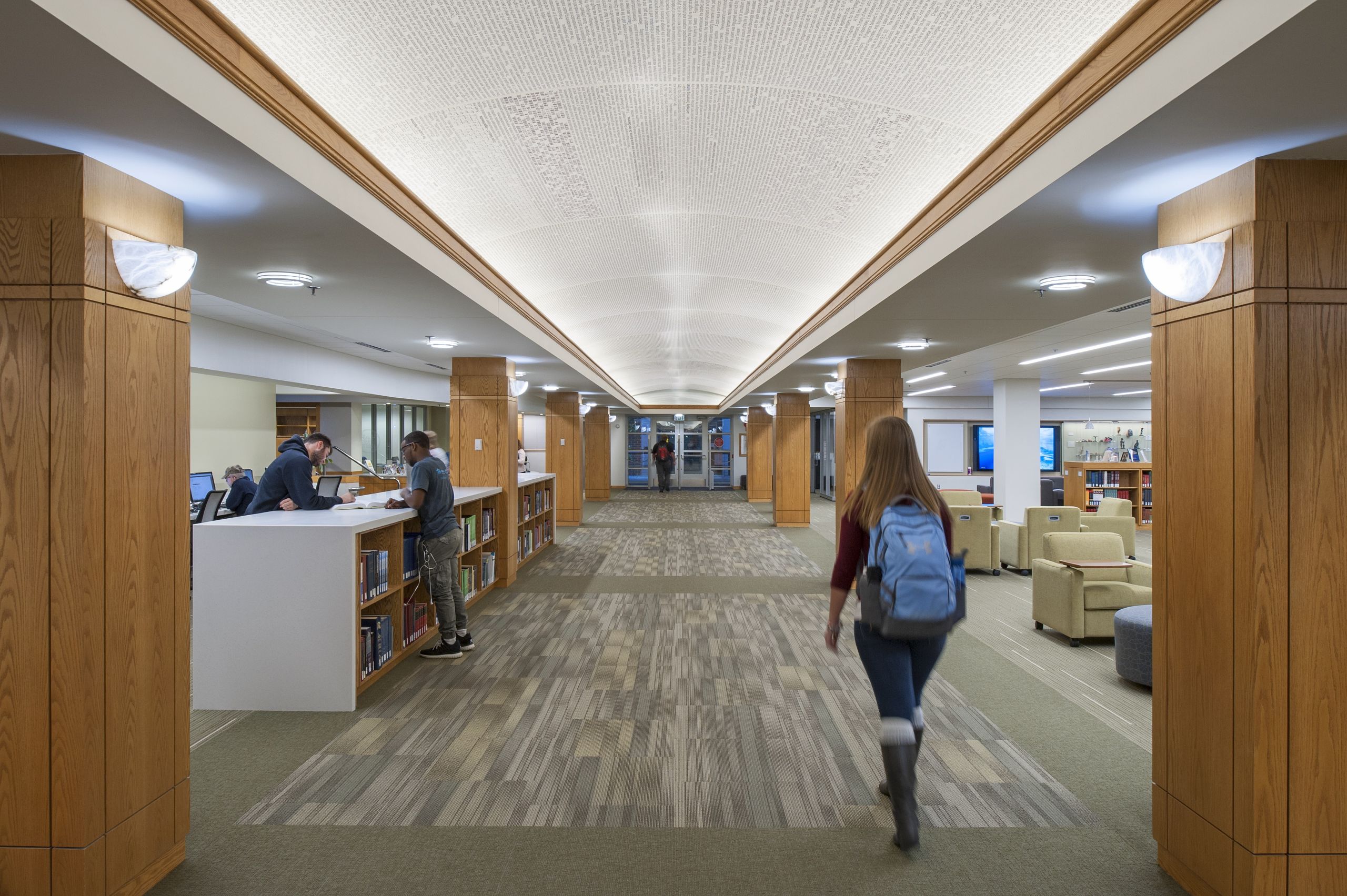 Breslin Architects originally designed this library in 1994 utilizing the original 1957 library structure. Twenty years later, the college asked Breslin Architects to upgrade the library interiors to create a rejuvenated 21st century learning and research center. The primary element of the renovation is a newly imagined vault running the length of the library. The college’s staff selected excerpts of iconic written works representing their different departments. These excerpts were then imprinted onto the vault’s surface. The text creates a textured pattern for the vault’s ceiling and when viewed attentively, allows students to discover the rich content that encompasses them in their new learning center. The majority of the shelving on the main floor was removed to transform the space into a new learning commons. A variety of movable seating promotes flexibility for both individual study and for group learning. Glass-partitioned study rooms and a large classroom with interactive technologies showcase the activities within the library and allow for groups to collaborate within their own spaces. The existing standing-height circulation desk was replaced with a new concierge type desk. A new coffee house was added to allow students to break away from their studies while remaining in the library. The coffee house also serves as a staging kitchen for special events held in the atrium reading room.
