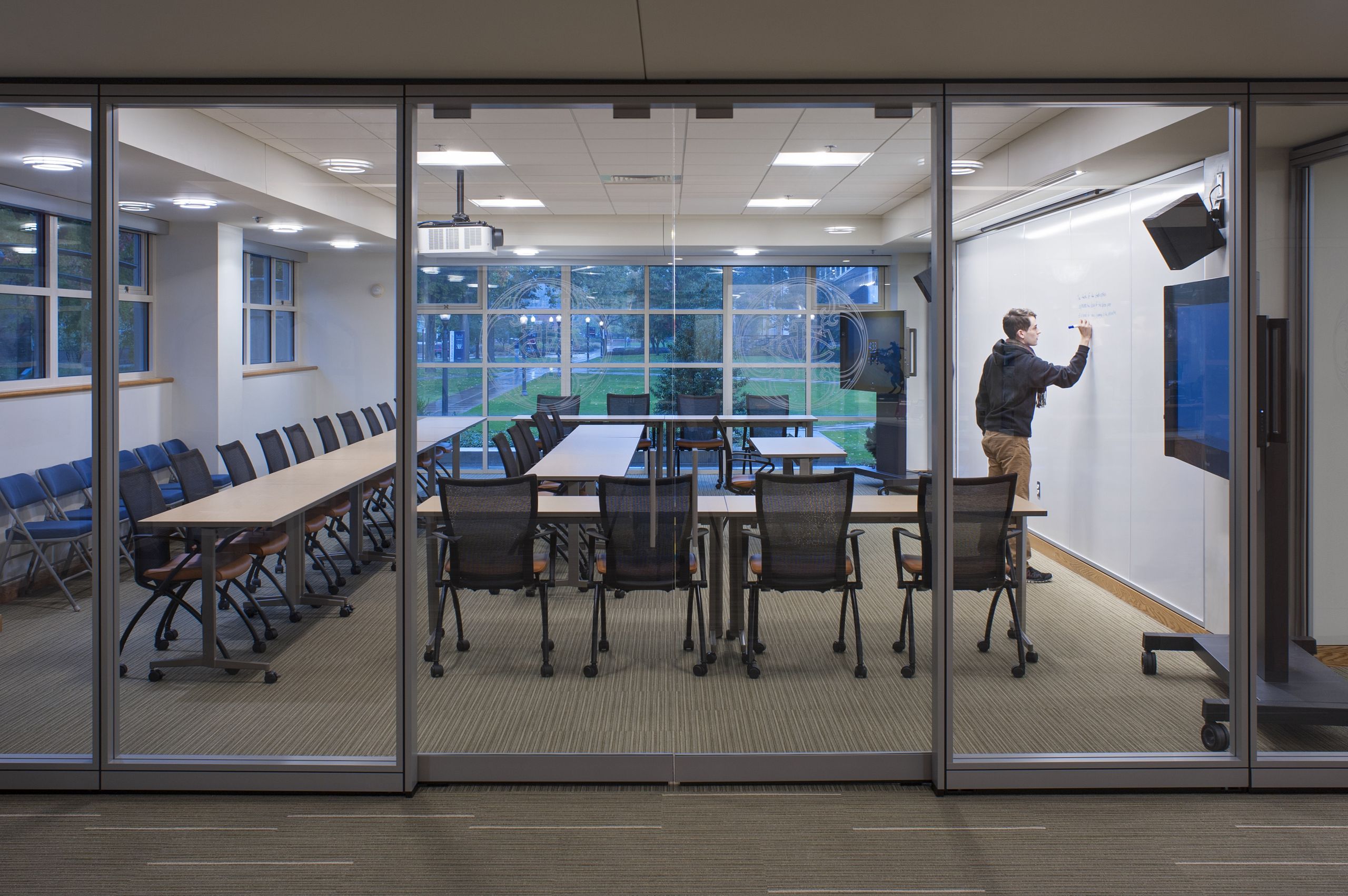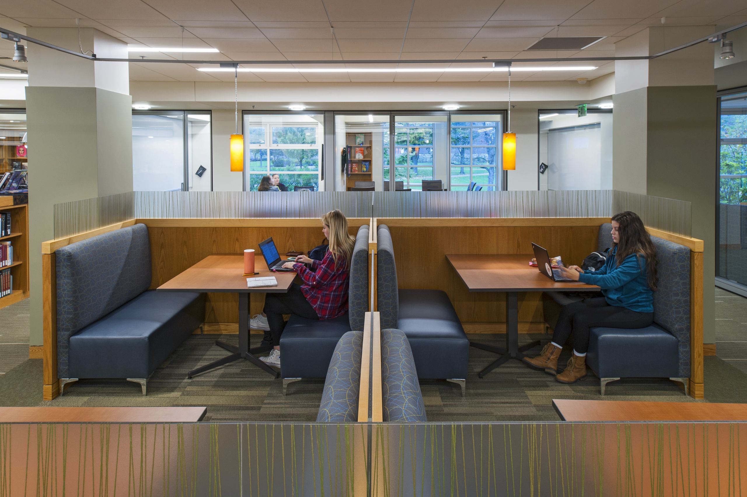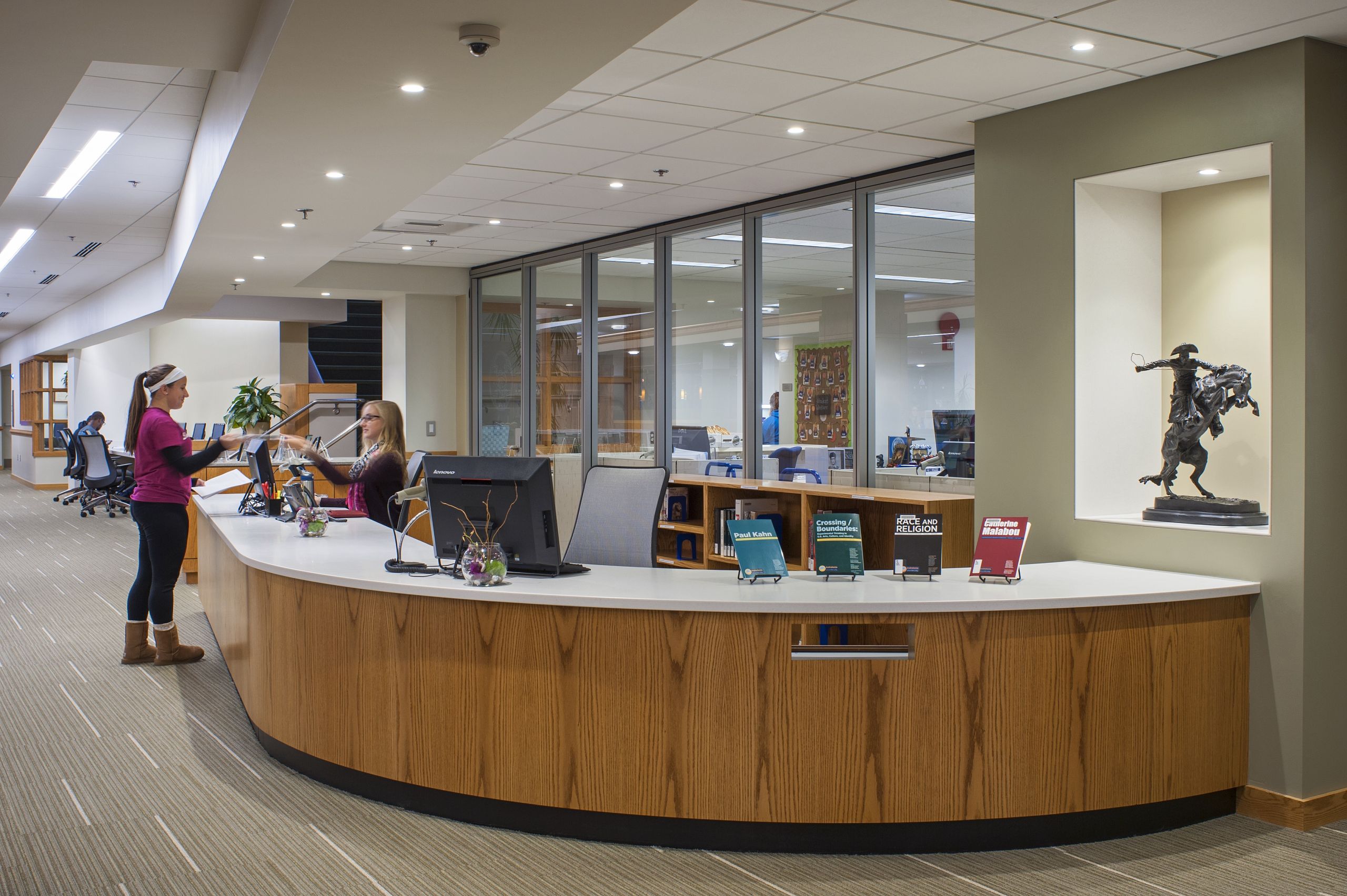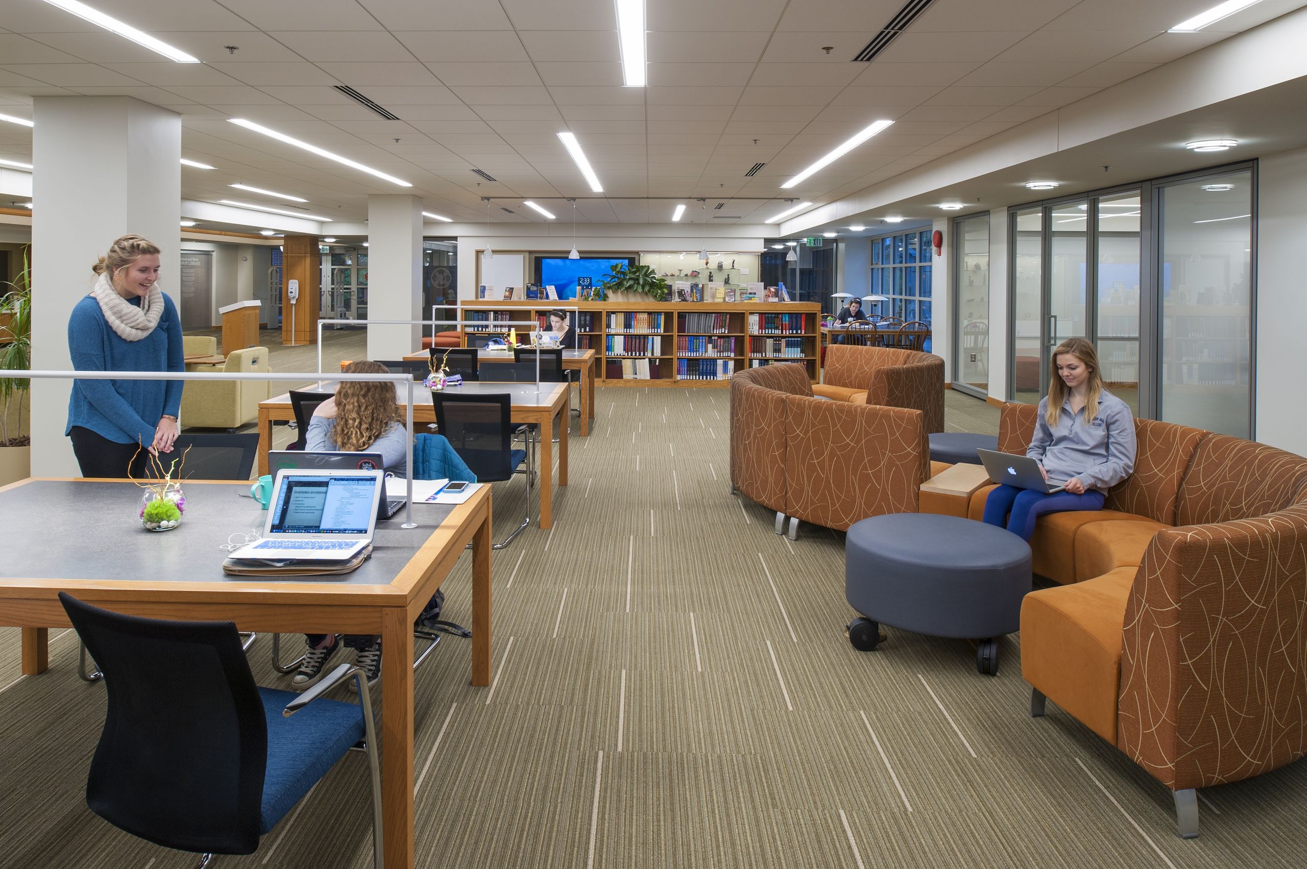 Breslin Architects originally designed this library in 1994 utilizing the original 1957 library structure. Twenty years later, the college asked Breslin Architects to upgrade the library interiors to create a rejuvenated 21st century learning and research center. The primary element of the renovation is a newly imagined vault running the length of the library. The college’s staff selected excerpts of iconic written works representing their different departments. These excerpts were then imprinted onto the vault’s surface. The text creates a textured pattern for the vault’s ceiling and when viewed attentively, allows students to discover the rich content that encompasses them in their new learning center. The majority of the shelving on the main floor was removed to transform the space into a new learning commons. A variety of movable seating promotes flexibility for both individual study and for group learning. Glass-partitioned study rooms and a large classroom with interactive technologies showcase the activities within the library and allow for groups to collaborate within their own spaces. The existing standing-height circulation desk was replaced with a new concierge type desk. A new coffee house was added to allow students to break away from their studies while remaining in the library. The coffee house also serves as a staging kitchen for special events held in the atrium reading room.