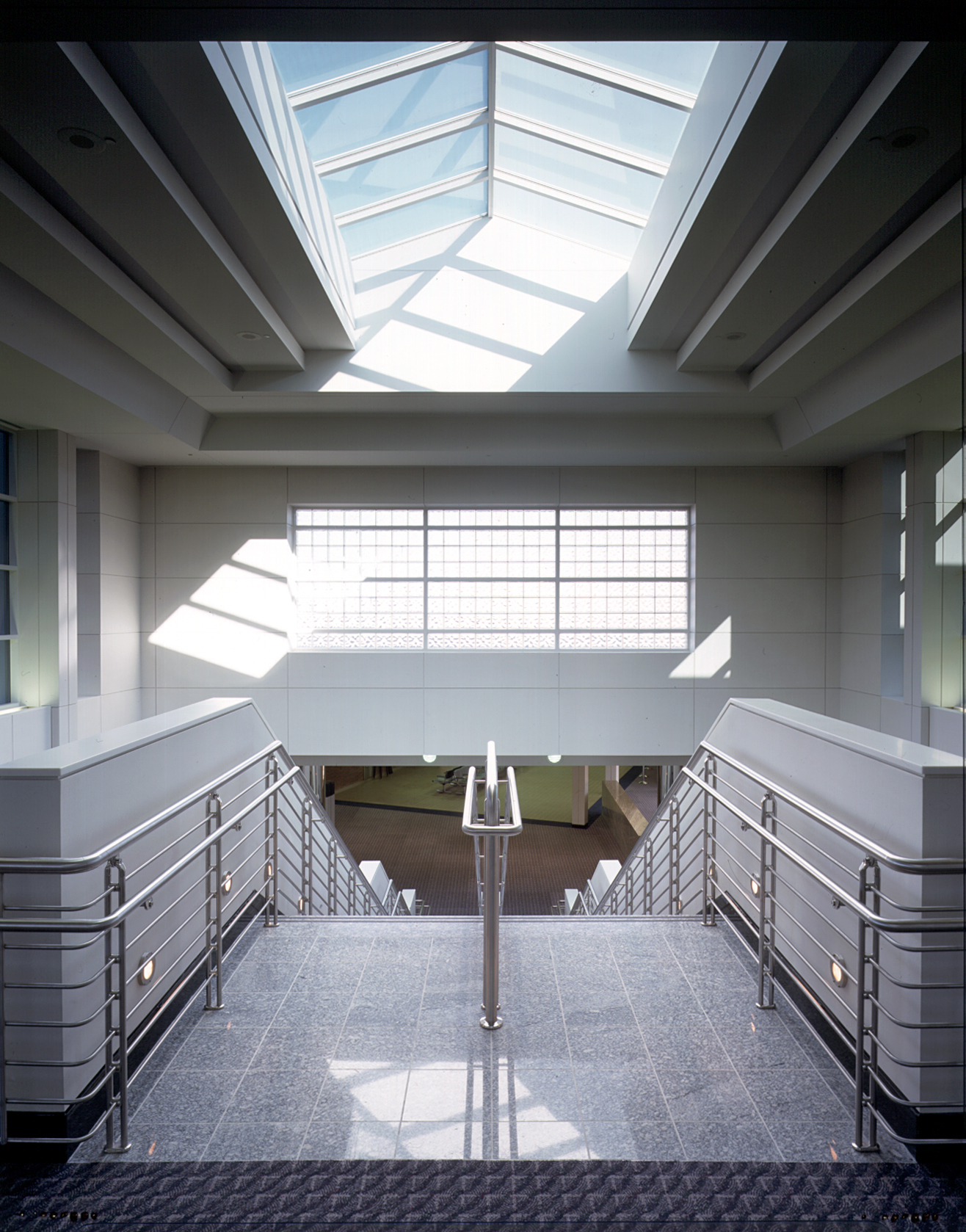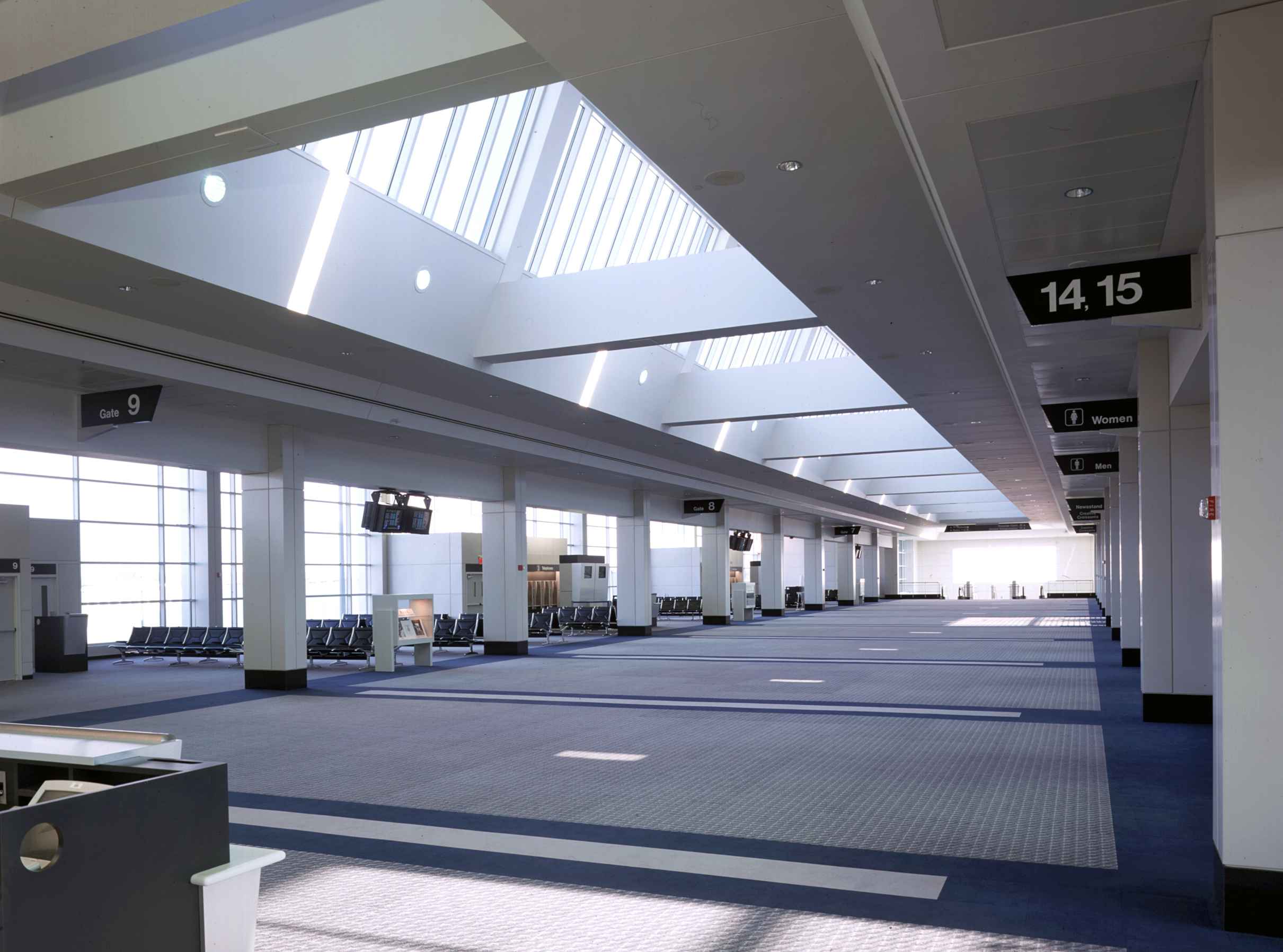 Breslin Architects was honored with an “Award of Merit” from the American Institute of Architects/ Eastern Pennsylvania for the design of this project. Designed as a new “gateway” to the Lehigh Valley, this terminal expansion provides 7 gates for narrow body jets and 2 gates for regional aircraft. Large expanses of glass offer views of the planes, runways, and distant mountains, enhancing the traveler’s experience. The continuous, north facing, skylight monitor fills the main concourse with natural light and creates a lofty, soaring feeling, Granite, custom carpeting and stainless steel railings define the interiors. On the exterior, a modern image is conveyed by the strong rhythm of structural columns, glass curtainwall, and white metal panels. Crisp detailing further imbues the building with a strong character and high-tech efficiency.