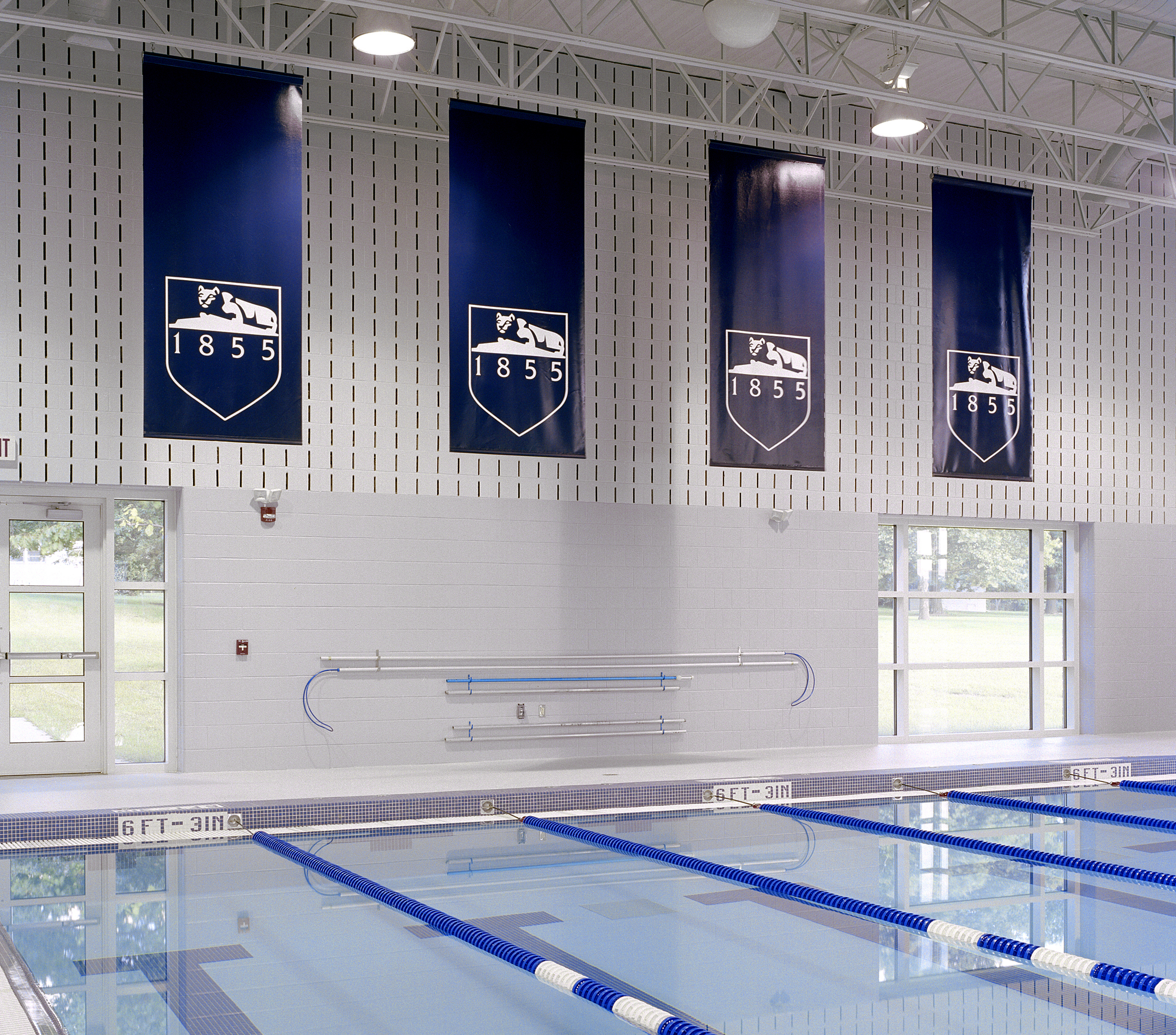 Breslin Architects was commissioned by Penn State University to design this Natatorium as an addition to the Capital Union Building at the Harrisburg, Pennsylvania campus. The existing building houses recreation and fitness areas as well as a gymnasium and locker rooms. The design allows existing locker rooms to serve both the existing functions as well as the new pool. The Natatorium is a state-of-the-art aquatic center that provides opportunity for student competition or lap swimming and the pool depth has been designed to provide maximum space for recreational swimming. The exterior of the Natatorium uses a palette of brick and concrete masonry to harmonize with the existing facility. Window walls provide abundant natural light and attractive vistas of the Penn State Campus.