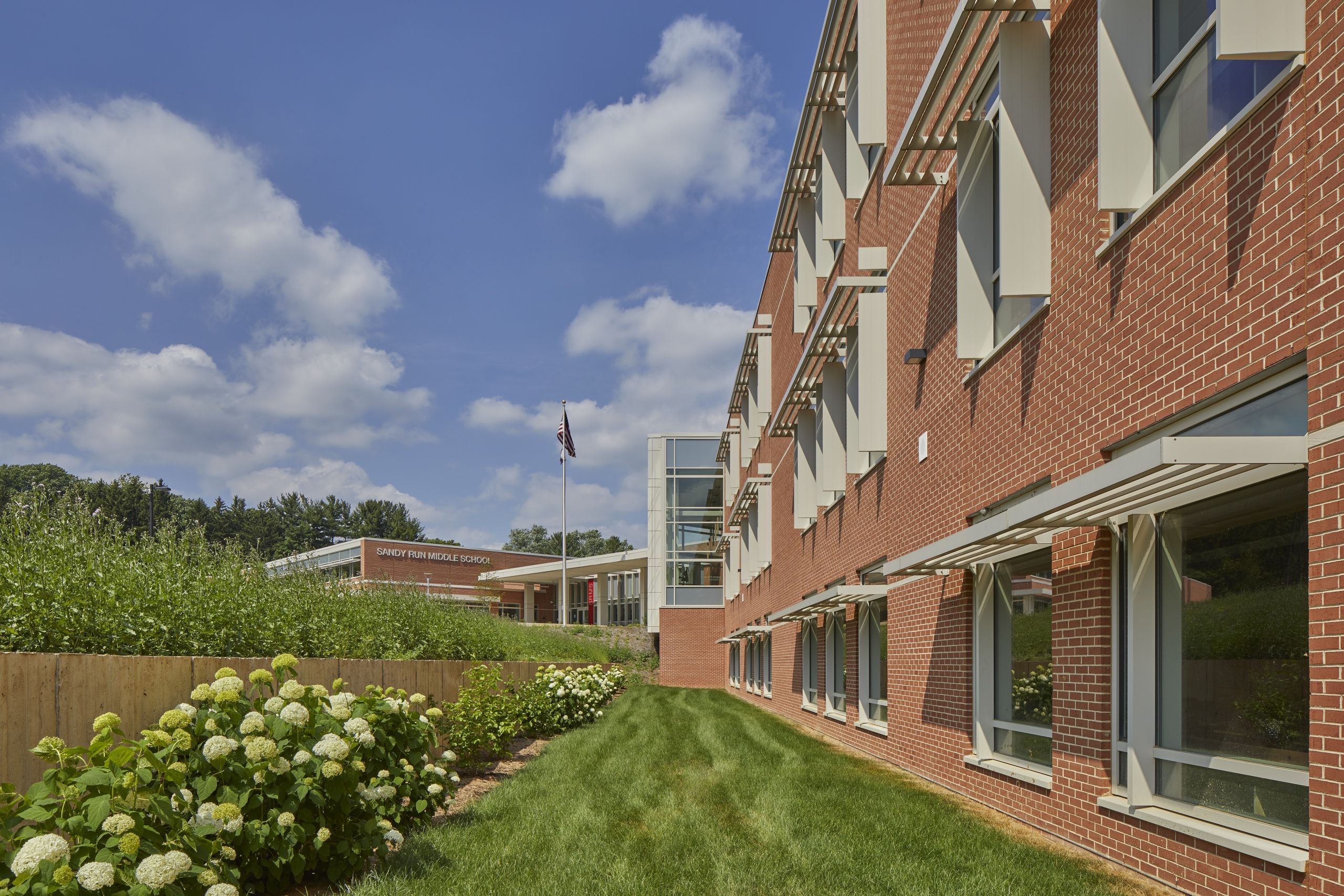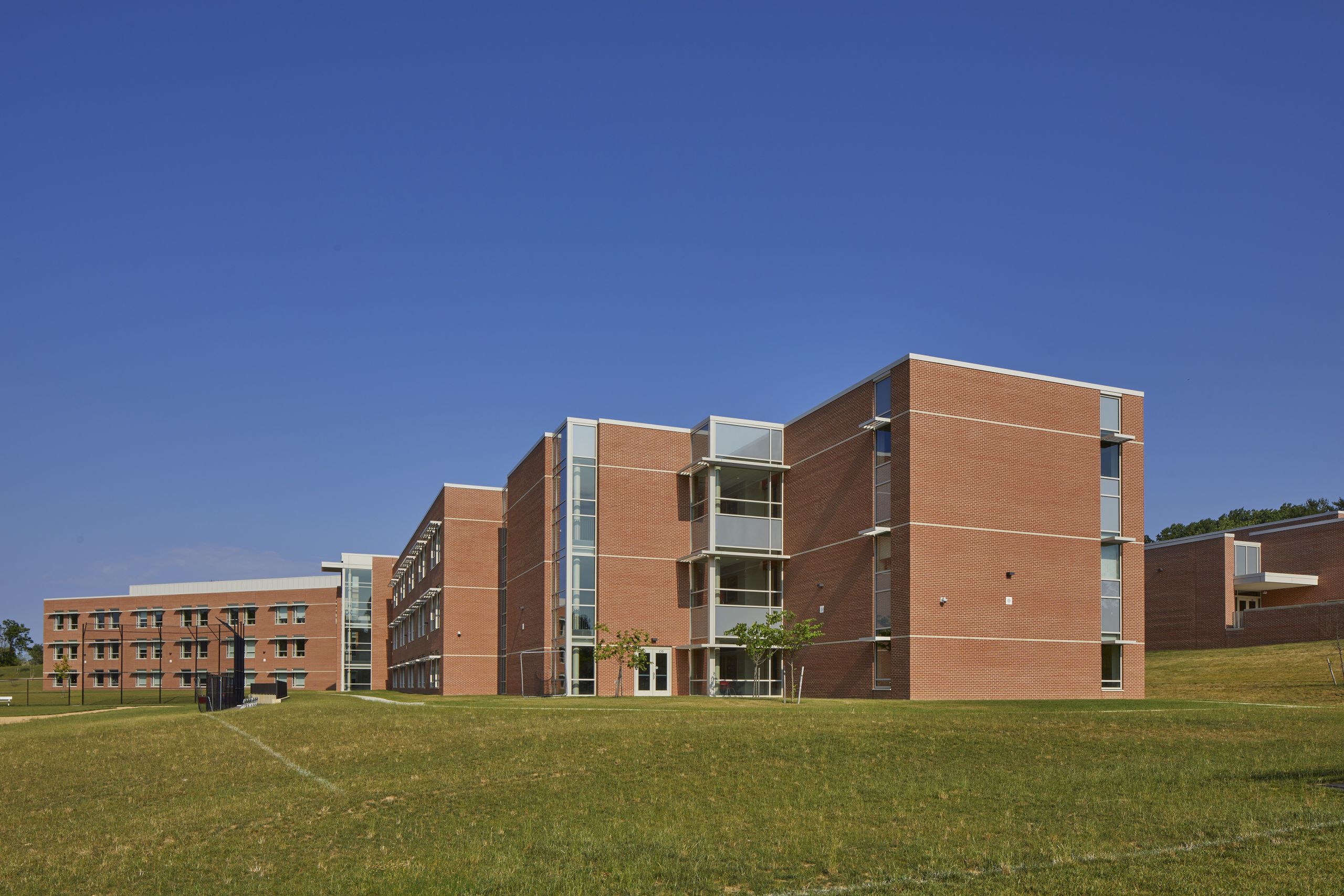 The new Middle School campus was developed on the same site as the existing building it replaced. The gradually sloping site is bordered to the South by the Sandy Run Creek. This dominant landscape feature is embraced by the Academic component of the complex in its form as well as through centrally located collaborative areas on each academic floor which focus on the Creek. The School for 1,000 students is divided into two distinct elements, a three-story Academic Wing for Grades 6, 7 & 8 and a one-story Shared Use Wing which contains all public functions.