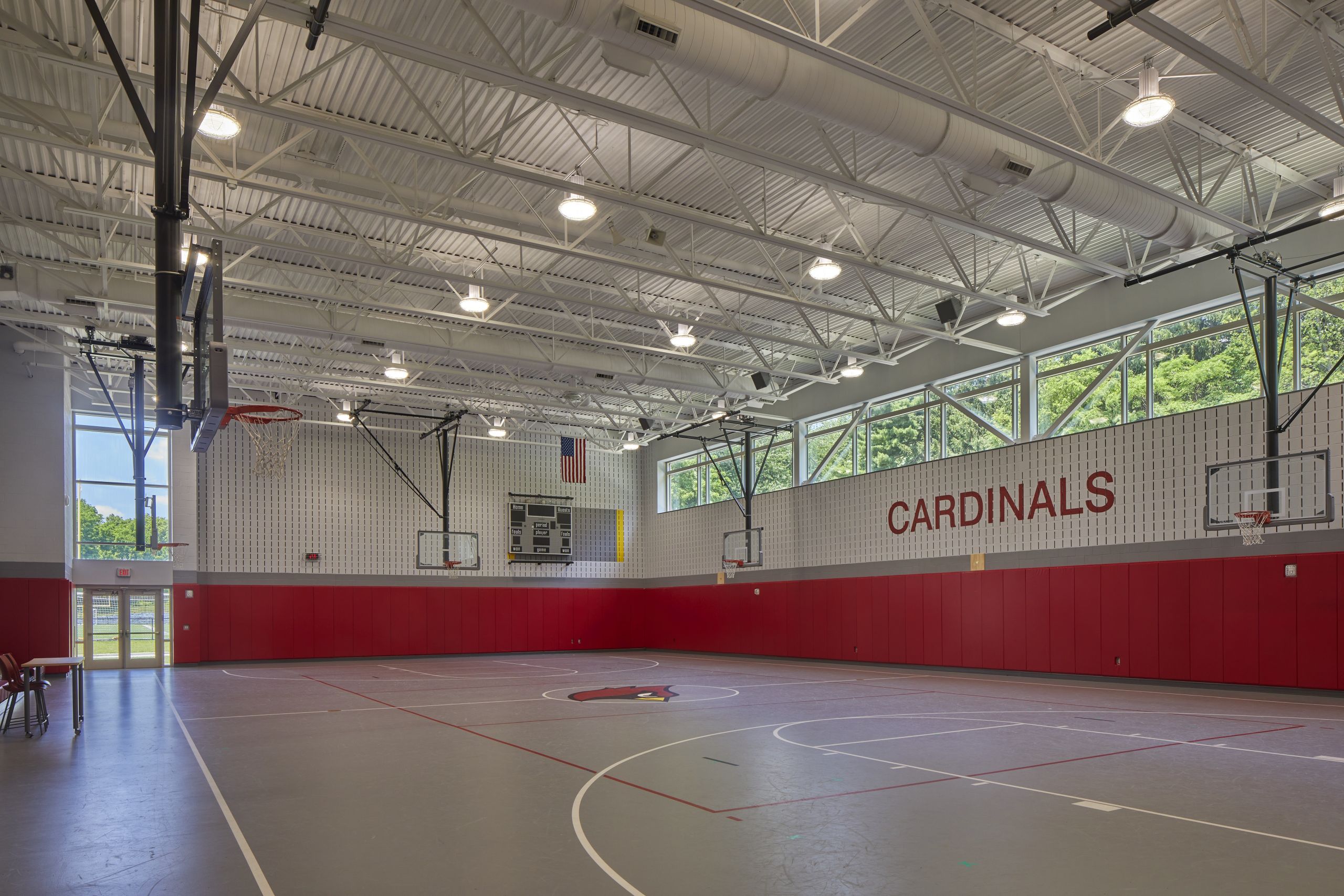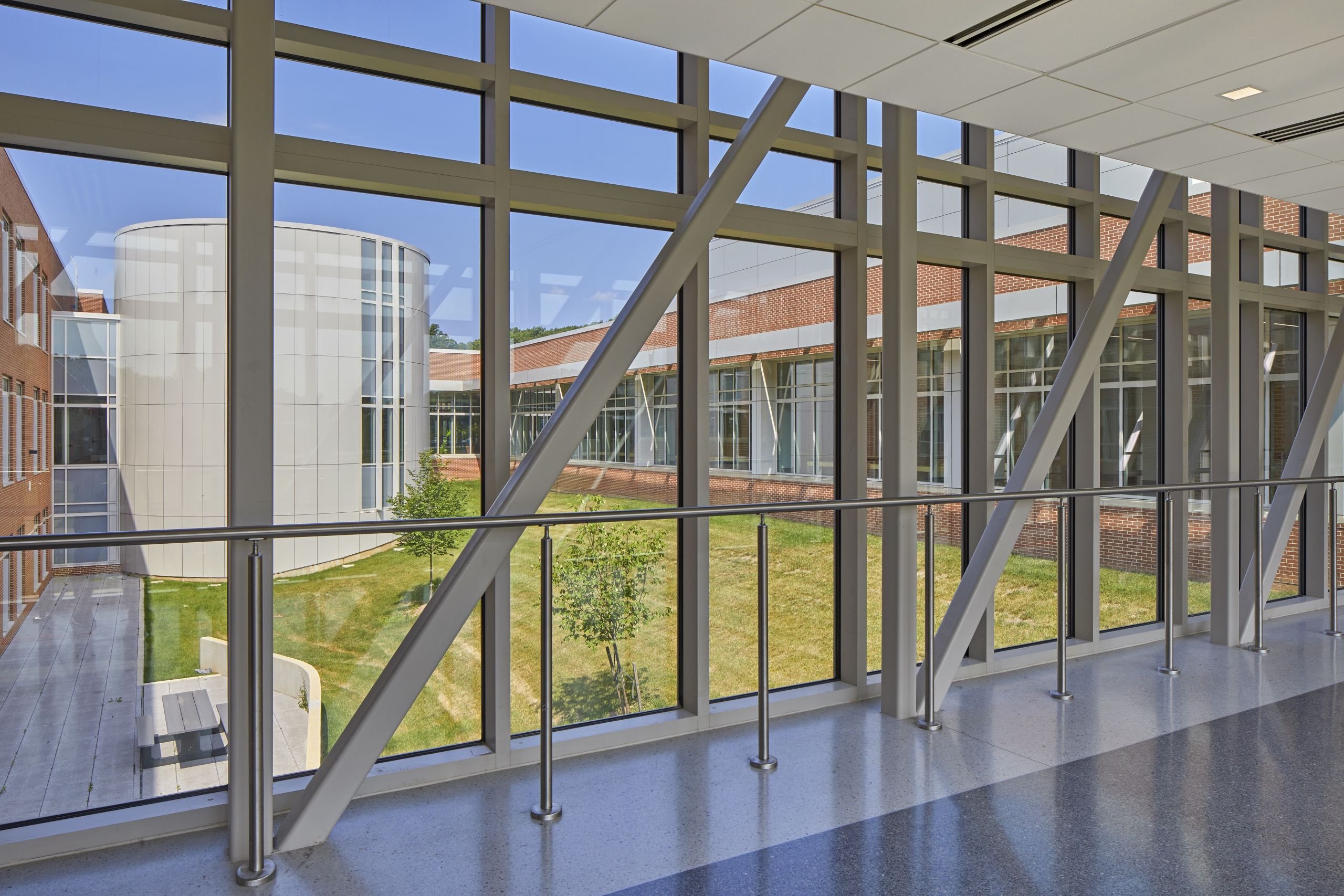 The splayed Academic wing allows for the creation of a central node that houses the Library & Large Collaborative Areas. Science Labs and Special Education Classrooms directly relate to Smaller Collaboration zones which are equally dispersed on all three floors. Access between the Academic wing and the public/shared use wing occurs primarily at the middle level of the the three-story academic wing – allowing for convenient access from the remaining upper and lower floors to the public spaces. Additionally, a glazed cross corridor punctuates the courtyard at the eastern edge and facilitates additional interaction between the two building components. The project received LEED Gold Certification.