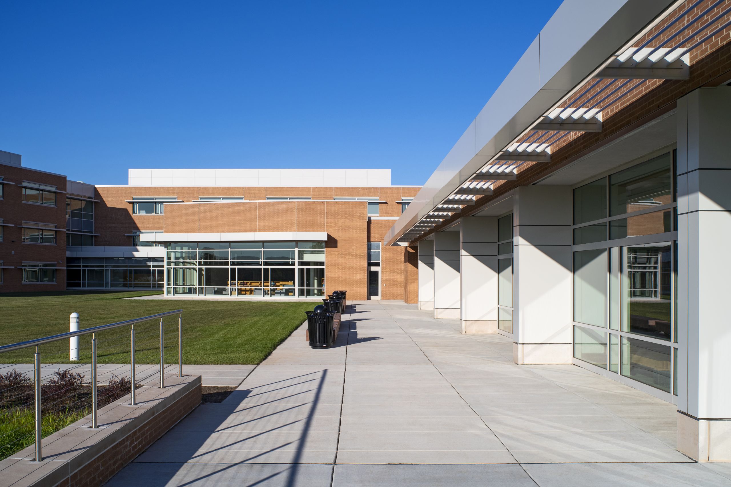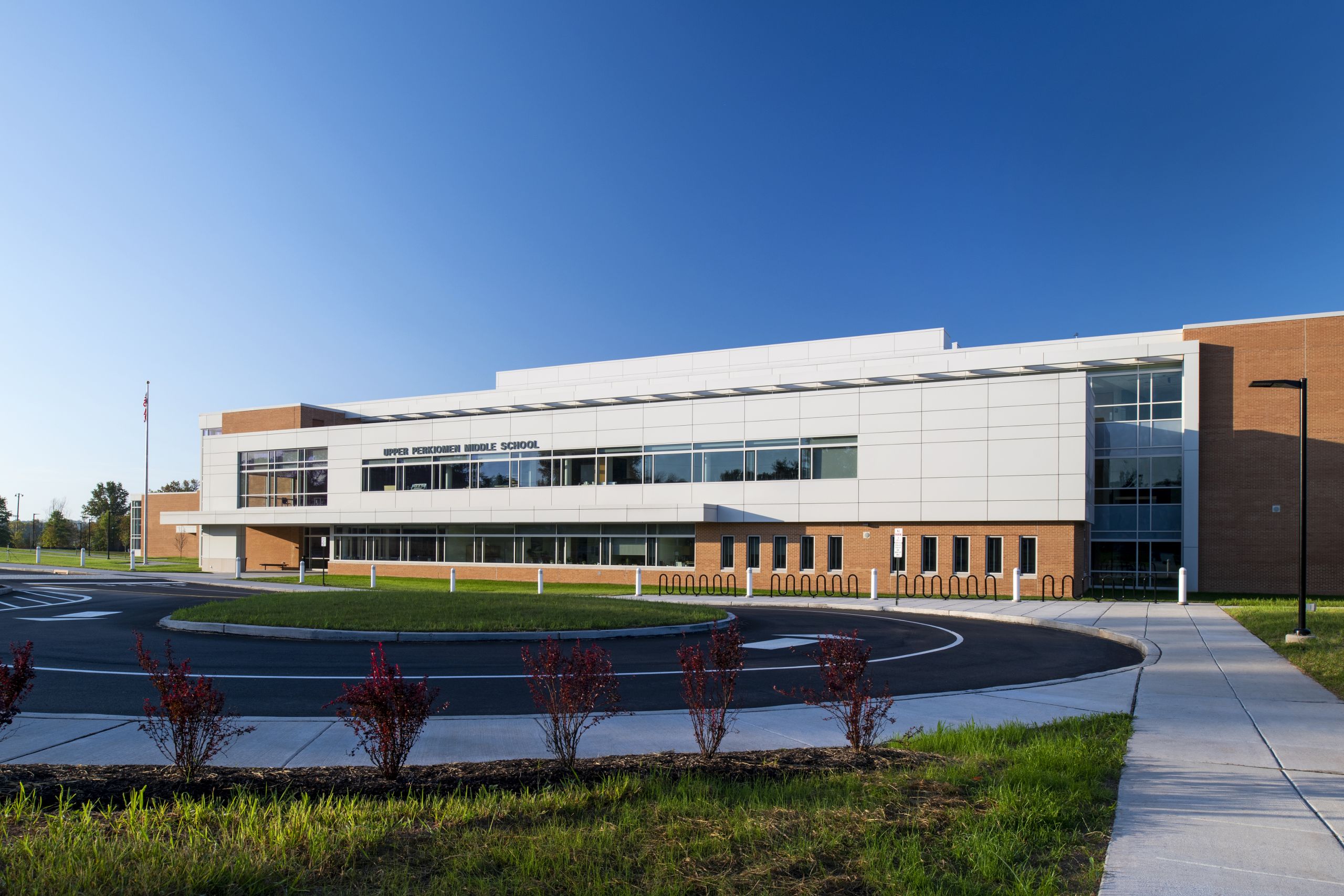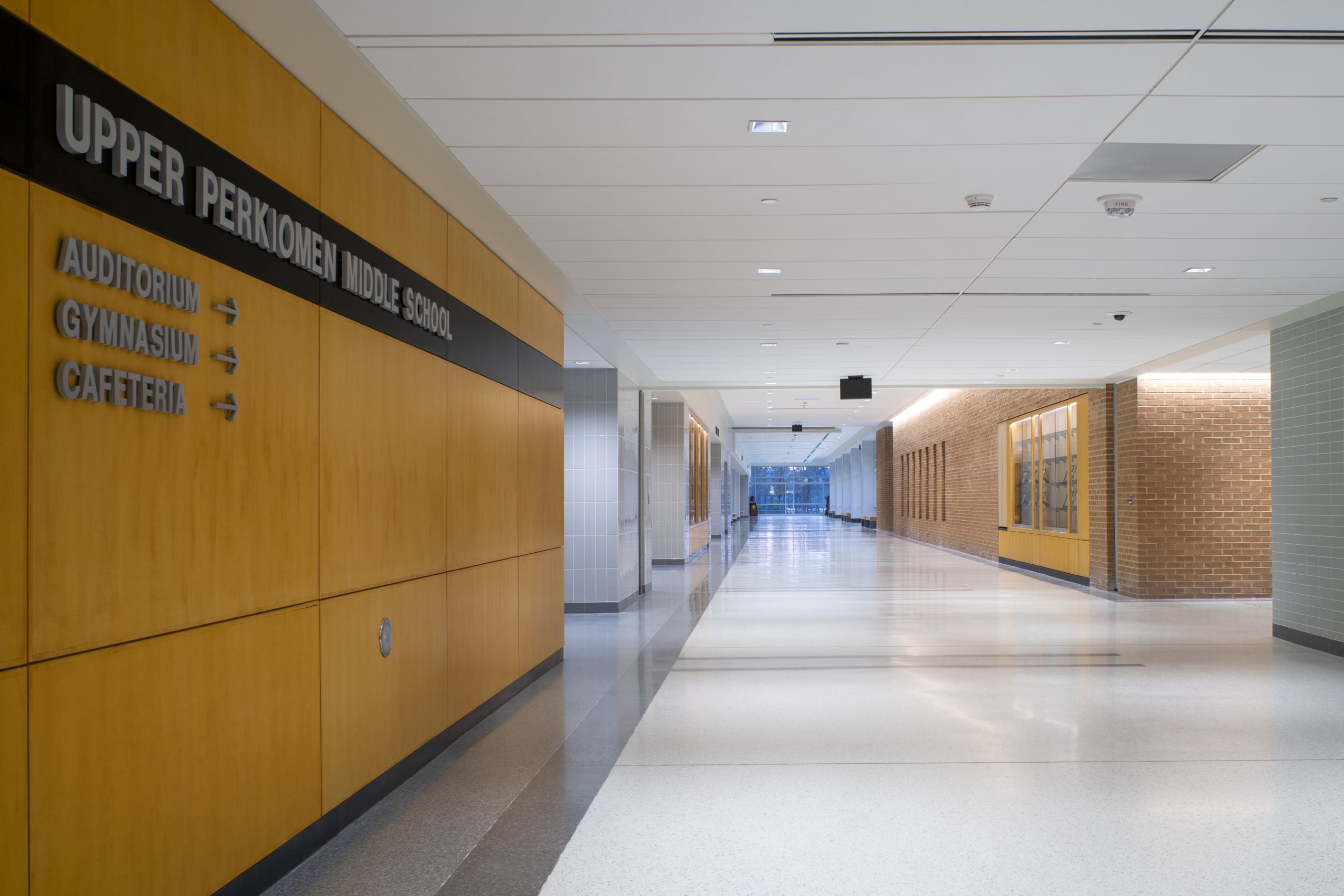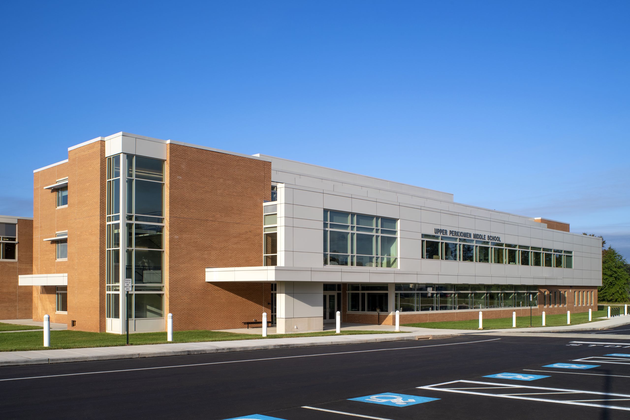 The form of this building evolved as a direct response to the predominant site feature – the Green Lane Reservoir which borders the edge of the site. The design intent was to forge a relationship between the building and the reservoir, with the three dimensional organization of the building becoming an embodiment of the site. The public functions of the building are organized along the eastern edge of the site, while the academic functions splay along a northwest axis in order to allow for expansive views of the reservoir and to capture maximum daylighting within the classroom spaces. The courtyard between these two building components embraces the reservoir and is hinged by an Administrative block along the northern edge. This Administrative block provides a public identity to the community at large. The Library anchors the composition at the heart of the building as it meshes with the site and reservoir beyond. The predominantly masonry construction with punched openings evolves into metal clad elements with expansive glazing and views to reinforce the connection to the reservoir. The project has been awarded LEED Gold Certification by the U.S. Green Building Council for incorporation of energy efficient systems, sustainable design principles, and site design features that support long term ecological balance. The new Middle School not only provides a state of the art facility for learning – the building itself is a tool for learning that fosters each student’s appreciation of the natural world.