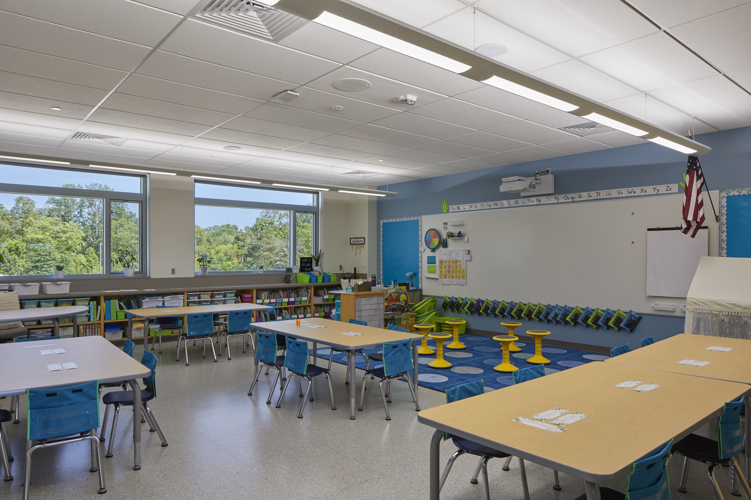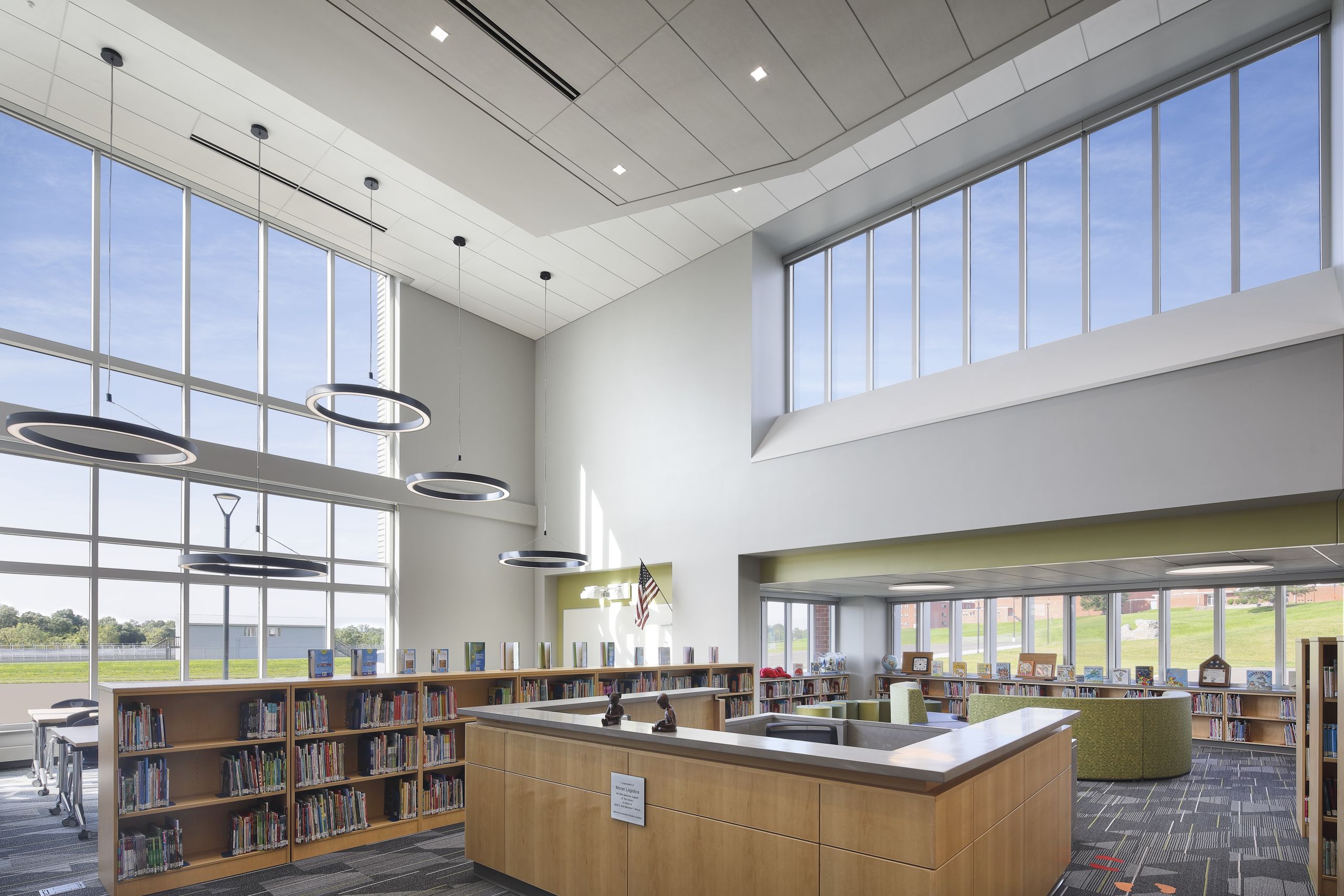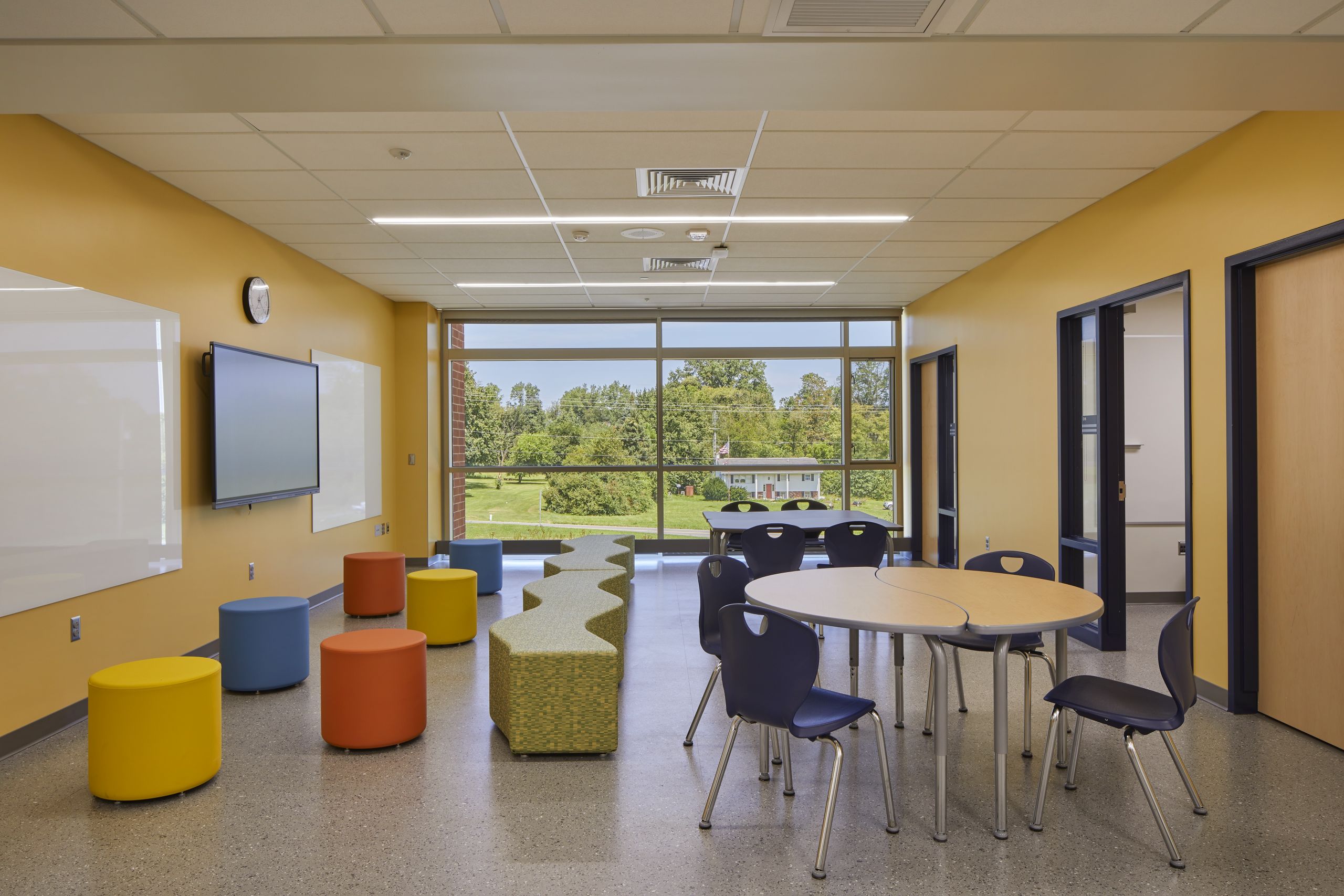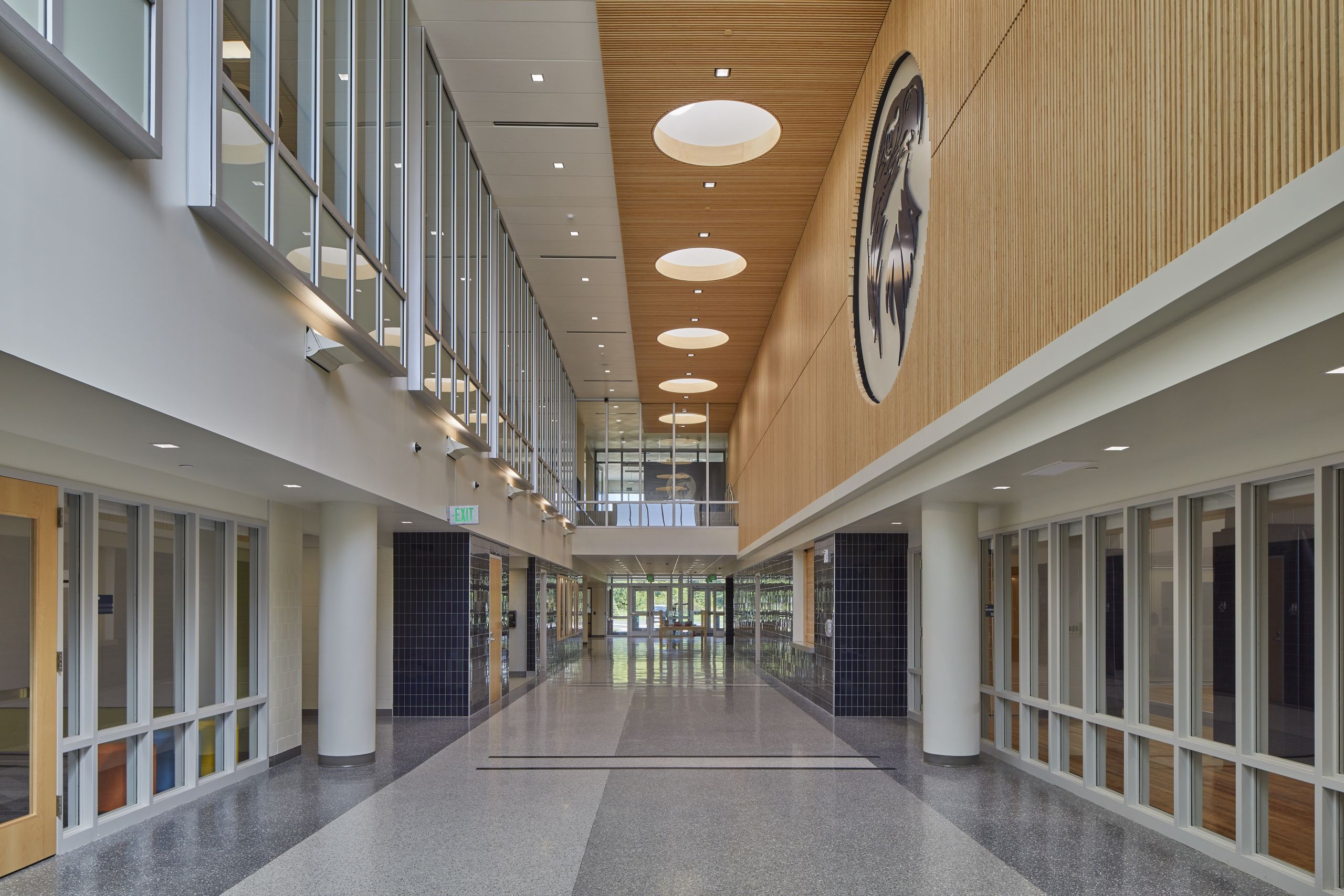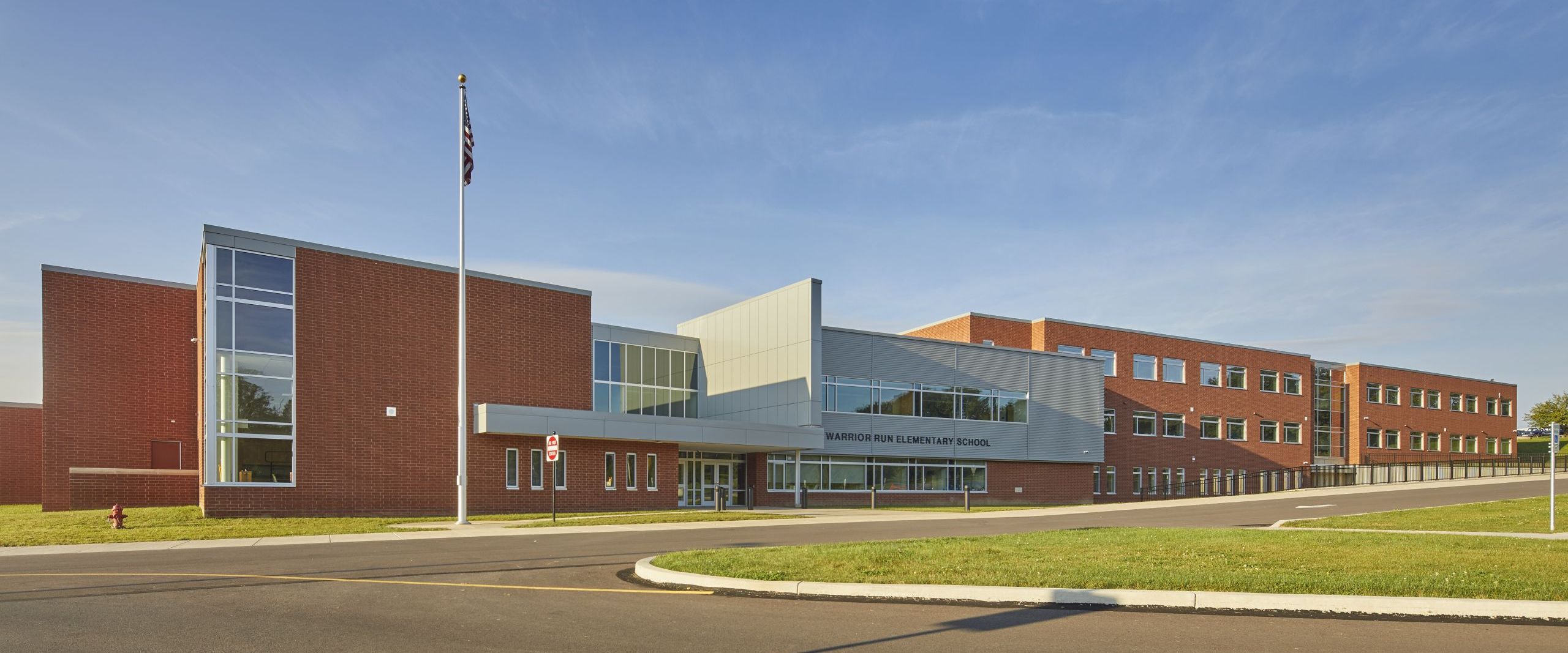 This project replaced two aging elementary schools with a new 100,000 square foot K-6 school on the same campus as the Middle School/High School. To meet Warrior Run School District’s goals for the project, the ideal location for the new school was also the most challenging with a 60’ elevation change across the site. Breslin Architects’ solution is a school that integrates with the slope of the site. The 3-story academic wing provides a dedicated area for Kindergarten on the 1st floor with direct access to their own playground. On the 2nd and 3rd floors, learning is on display with windows between the Corridors and Classrooms. At the heart of the Academic Wing are Collaboration Spaces and Small Group rooms to support 21st Century Learning. The 3rd floor features a bridge to an Outdoor Classroom and walkway to the Middle School. The shared use and public spaces, including Administration, the Multi-Purpose Room, Library, Large Group Flex Room, Music, Art, and STEM, are organized around a central 2-story skylit Lobby featuring a Learning Stair. Breslin Architects worked closely with the School District on the site design which includes an inner campus bus loop and new Baseball, Softball, and Practice Fields. The existing Football Stadium is being transformed to a Multi-Sport Stadium with a new synthetic turf field and 6-lane track.
