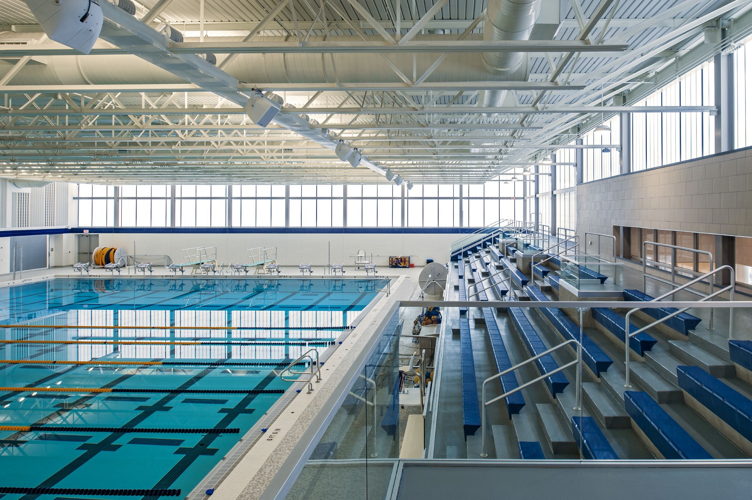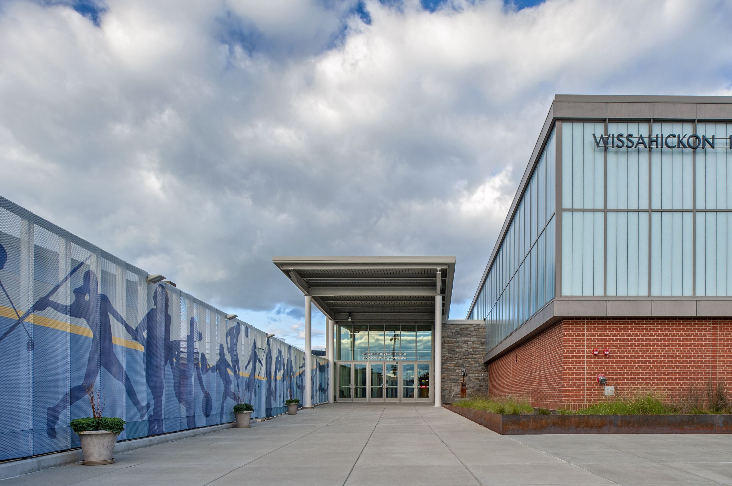 The Natatorium and Central Plant addition provides state-of-the-art swimming facilities and an upgraded mechanical system to the existing Wissahickon High School originally constructed in 1963. The swimming pool will replace the overtaxed and dated facility at the Wissahickon Middle School, and will be used for swimming and diving competitions, water polo matches, and recreational activities. A stretch-25 configuration, it can accommodate diving and swimming meets simultaneously, with a spectator capacity of over 350 people. The Central Plant component replaces the original school mechanical equipment that has outlived its project lifecycle. This project will provide more efficient sources of heating and cooling for the entire High School and allow for more flexibility in future construction and improvements to the High School Campus. The addition interfaces with the existing school with a new entry lobby that will support both the Pool and Wissahickon’s existing Round Gym, an iconic symbol of the school’s athletic program. The inviting lobby is characterized by dynamic roofs that take their cue from the motion of a swimmer’s strokes, while the exterior is a blend of materials that knit the existing brick, regional Wissahickon Schist, and bright translucent elements to mark a new chapter in the life of the school.